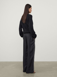 A sporty articulation of silk, the wide leg trousers are crafted in woven silk twill with a subtle shine. The relaxed fit, wide silhouette falls from an elasticated high waist into full-length legs and is finished with a contrast piping along the sides. DETAILS Fabrication: Woven Silk Twill Composition: 100% silk Weight: 195g SIZE GUIDE * European sizing * Designed for a relaxed fit * The model is 180 cm/5’11” tall and wears a size 1 Our sizes: Size 0: XS Size 1: S-M Size 2: M-L