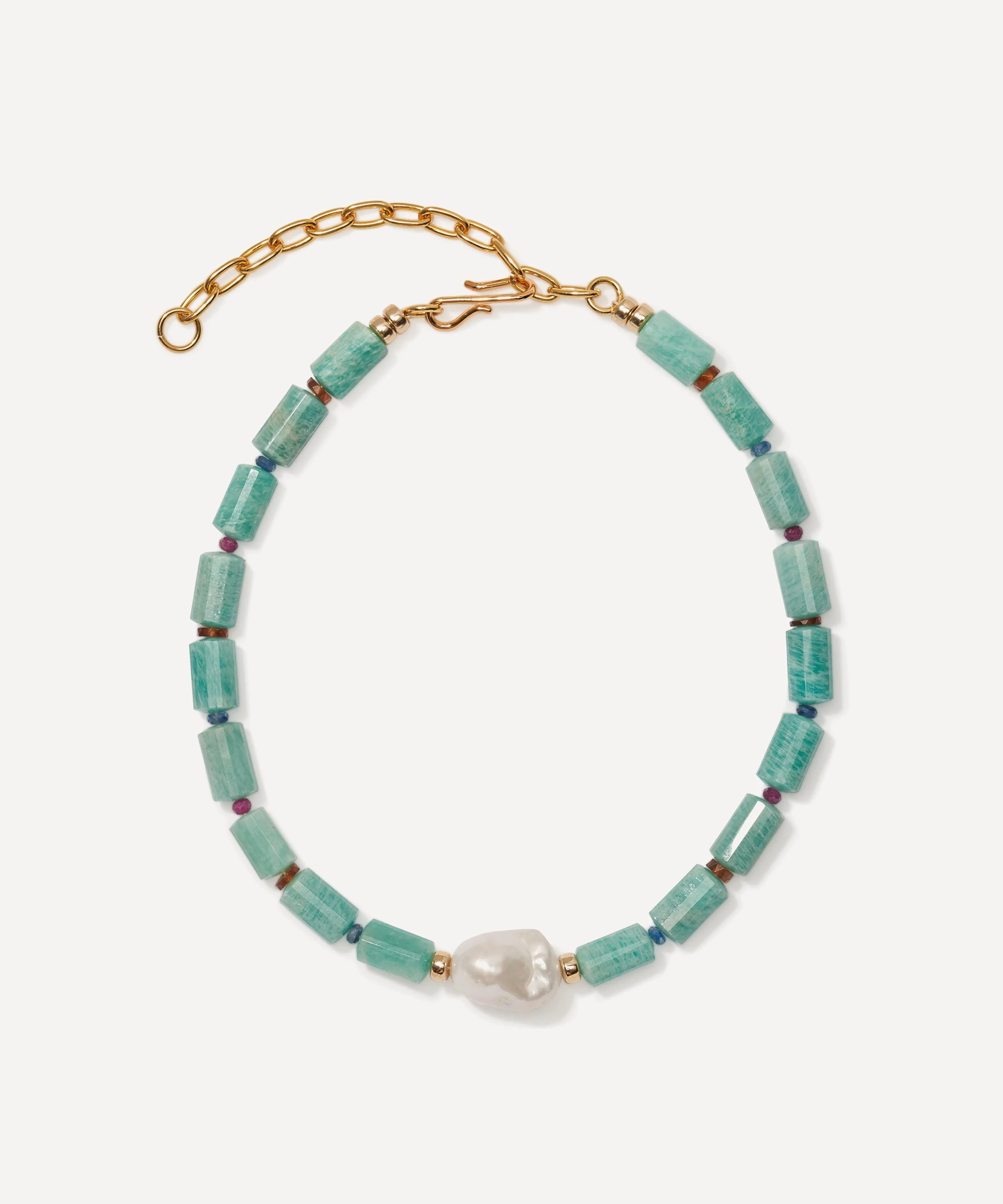 DETAILS Beaded necklace 24ct gold-plated brass Amazonite beads Faceted gemstone accents Freshwater baroque pearl focal S hook fastening COMPOSITION & SIZE 24ct Gold-Plated Brass; Gold-Fill; Freshwater Baroque Pearl; Hessonite Garnet; Kyanite; Ruby; Amazonite L: 38cm (10cm extender)