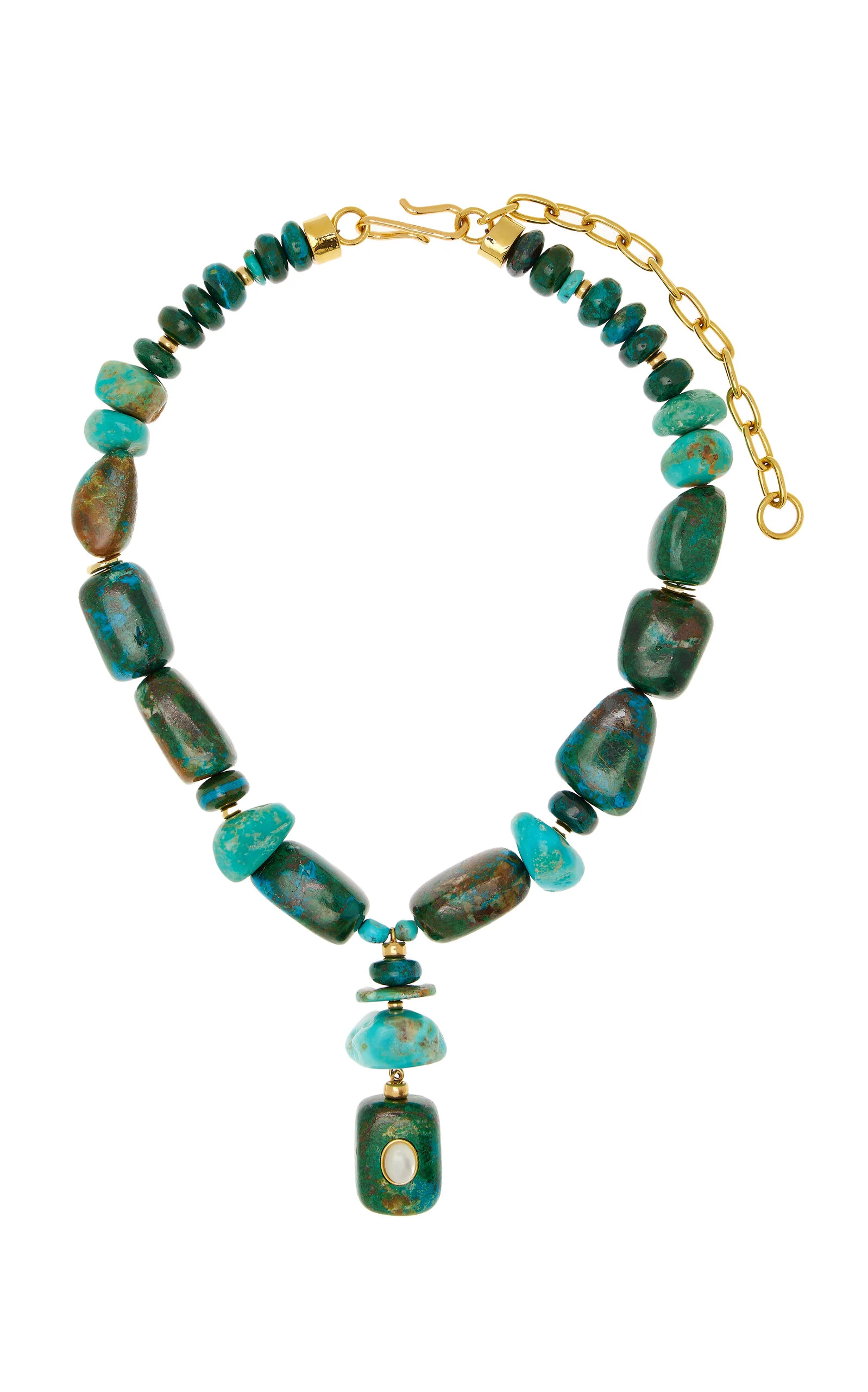Using an eclectic mix of found materials, Lizzie Fortunato creates statement jewelry imbued with a warm optimism. This season's lineup offers jolts of uplifting color that can easily be dressed up or down. PRODUCT DETAILS - S-hook fastening - Composition: chrysocolla, turquoise, mother-of-pearl - Made in the USA