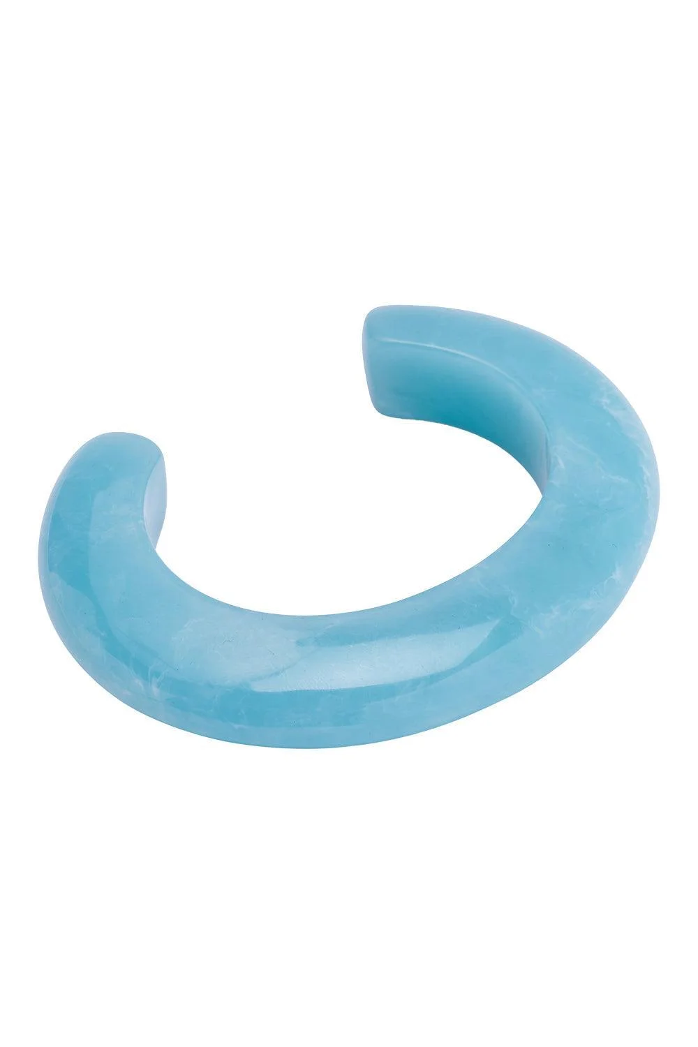 DETAILS AND INSIGHT Lizzie Forunato aquamarine marbled ridge cuff bracelet in blue. Show ’em your stack! This thin domed cuff bracelet in marbled aqua-hued resin looks stellar worn solo or stacked together. Push this statement piece high up the forearm for a snug fit and editorial look. Resin Marble Aquamarine 2.25" D Style FW23-B003