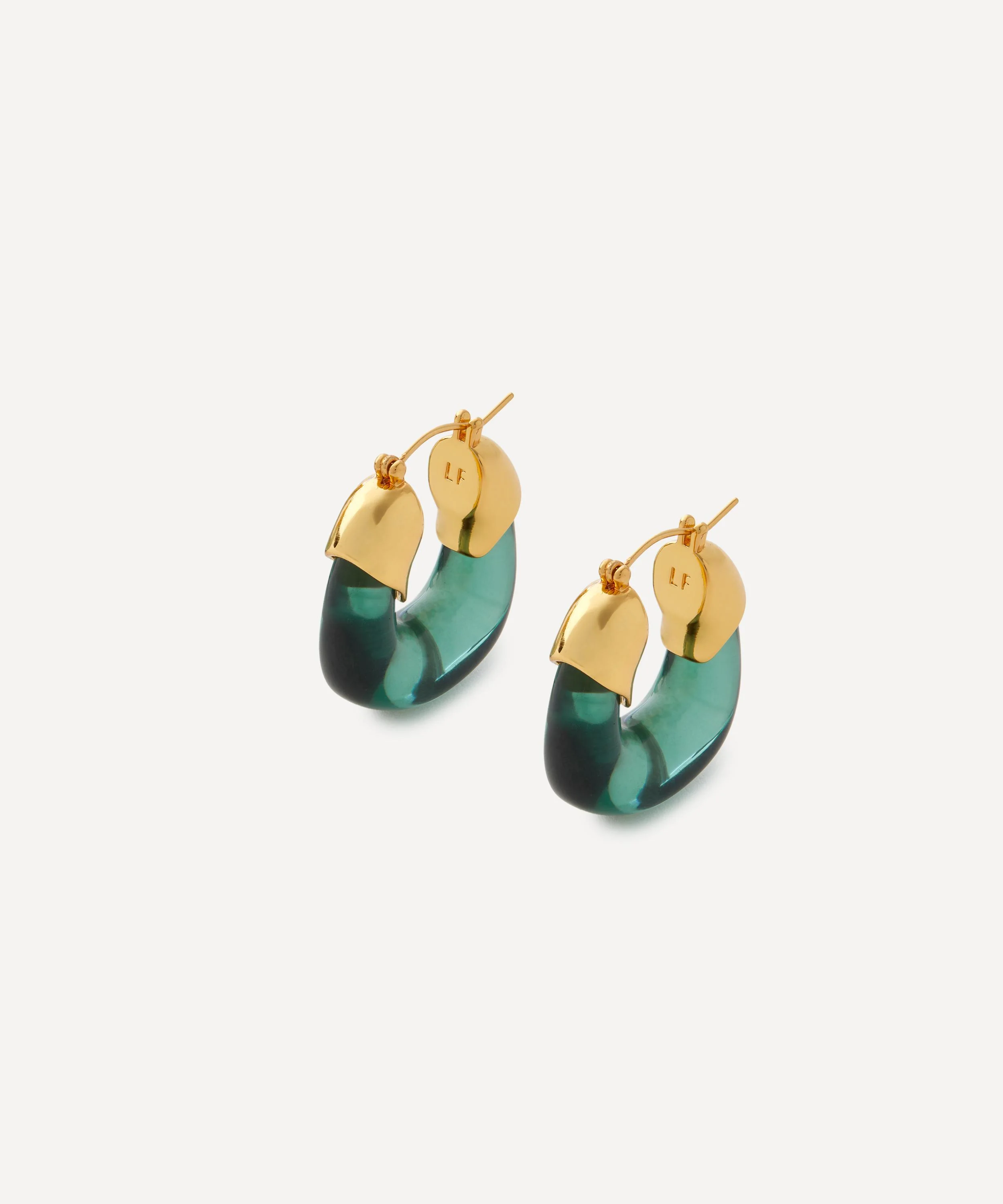 DETAILS Hoop earrings Gold-plated brass Organic silhouette Green-coloured resin French lock fastening COMPOSITION & SIZE Gold-Plated Brass; Resin Drop: 2.5cm