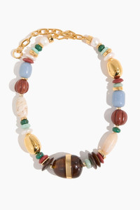 The Lizzie Fortunato Kona Collar will be a standout piece in your jewelry collection. This necklace features an array of chrysocholla, amazonite, angelite, clay, Australian opal, horn, and glass beads, freshwater pearl and gold-plated bead accents, and large tortoise-colored resin focal. FIT DETAILS - Necklace - Gold-plated brass, chrysocholla, amazonite, angelite, clay, Australian opal, horn, glass beads, freshwater pearl, resin - Length: 16"; Extender: 4.5"