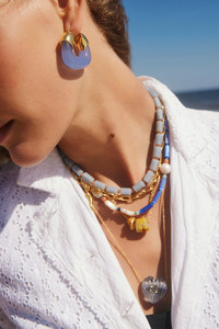 DETAILS AND INSIGHT Lizzie Fortunato organic hoop earrings in electric. 24k Gold Plated Brass, Transparent Cobalt Acrylic Drop: 1.5" Style R21-E016