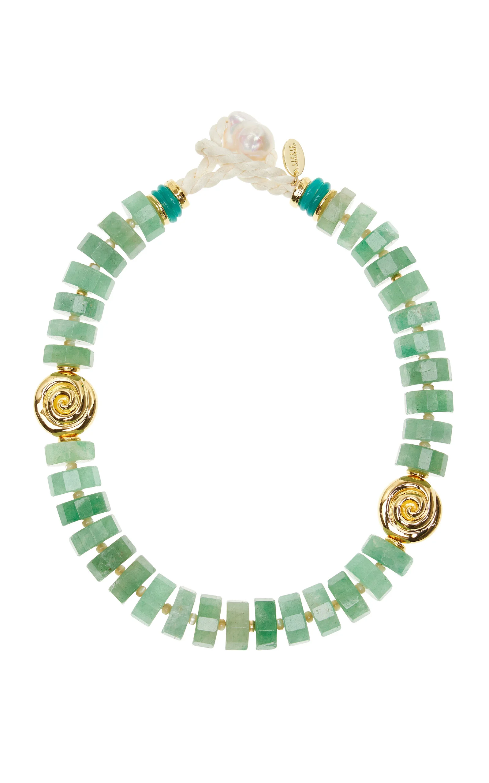 Using an eclectic mix of found materials, Lizzie Fortunato creates statement jewelry imbued with a warm optimism. This season's lineup offers jolts of uplifting color that can easily be dressed up or down. Green strawberry quartz beaded collar dotted with mother-of-pearl rondelles with gold-plated brass nautilus shell accent beads and freshwater pearl and silk cord toggle closure. PRODUCT DETAILS - Toggle fastening - Composition: quartz, mother-of-pearl rondelles, gold-plated brass, nautilus shell, freshwater pearl, silk cord - Made in the USA