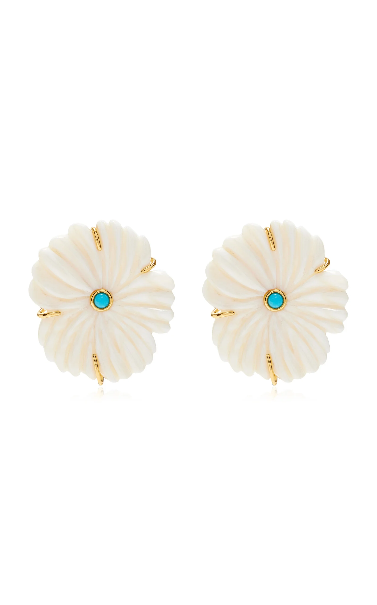 Using an eclectic mix of found materials, Lizzie Fortunato creates statement jewelry imbued with a warm optimism. This season's lineup offers jolts of uplifting color that can easily be dressed up or down. Gold-plated brass earrings with carved mother-of-pearl flowers set with turquoise stones. PRODUCT DETAILS - Post fastening for pierced ears - Composition: gold-plated brass, carved mother-of-pearl, turquoise - Imported