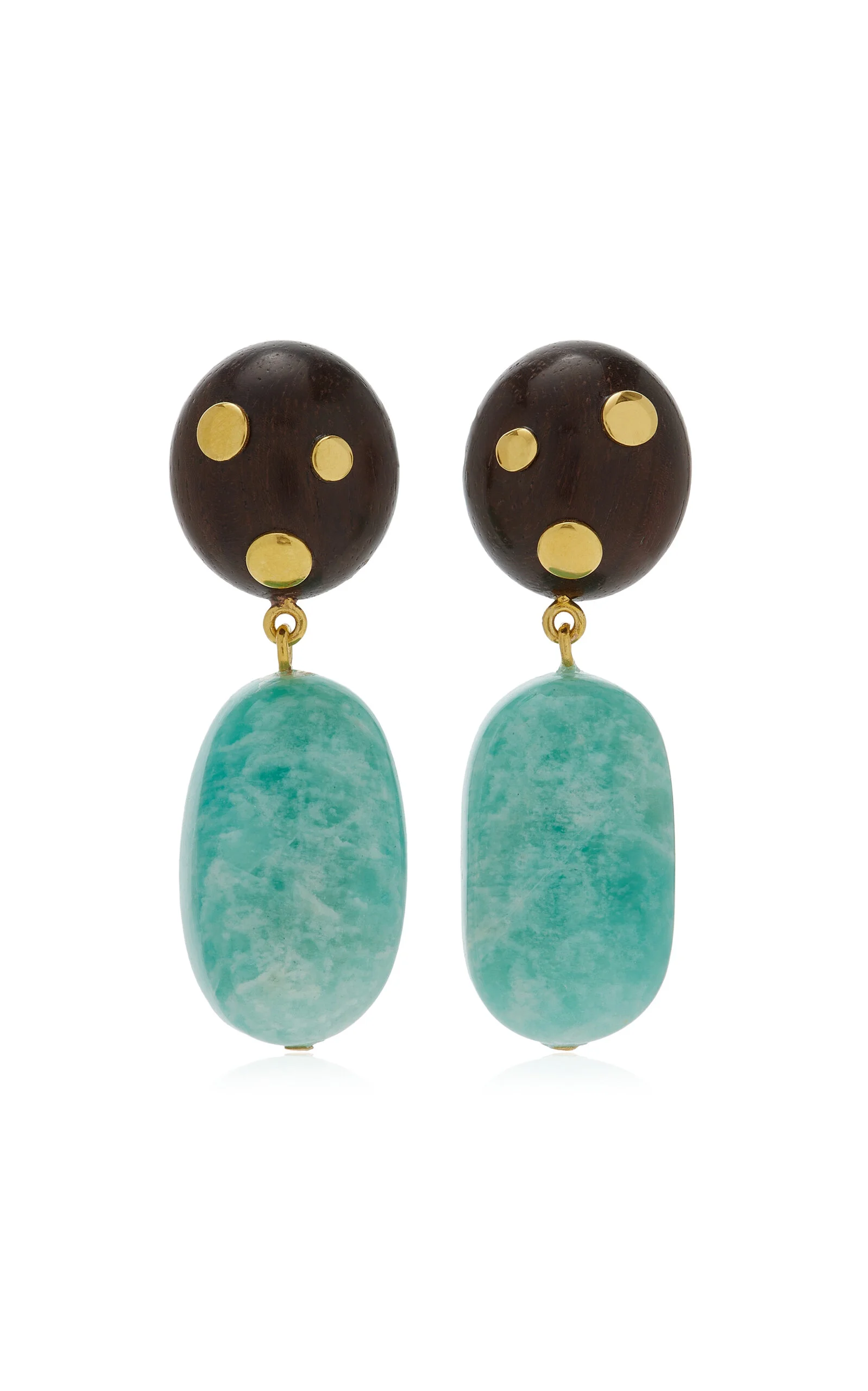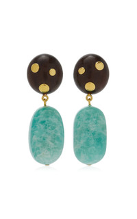 Using an eclectic mix of found materials, Lizzie Fortunato creates statement jewelry imbued with a warm optimism. This season's lineup offers jolts of uplifting color that can easily be dressed up or down. PRODUCT DETAILS - Gold-plated brass earrings with studded acacia wood tops and amazonite nugget drops, Gold-plated brass, acacia wood, amazonite - Post - Composition: Gold-plated brass, acacia wood, amazonite - Made in the USA