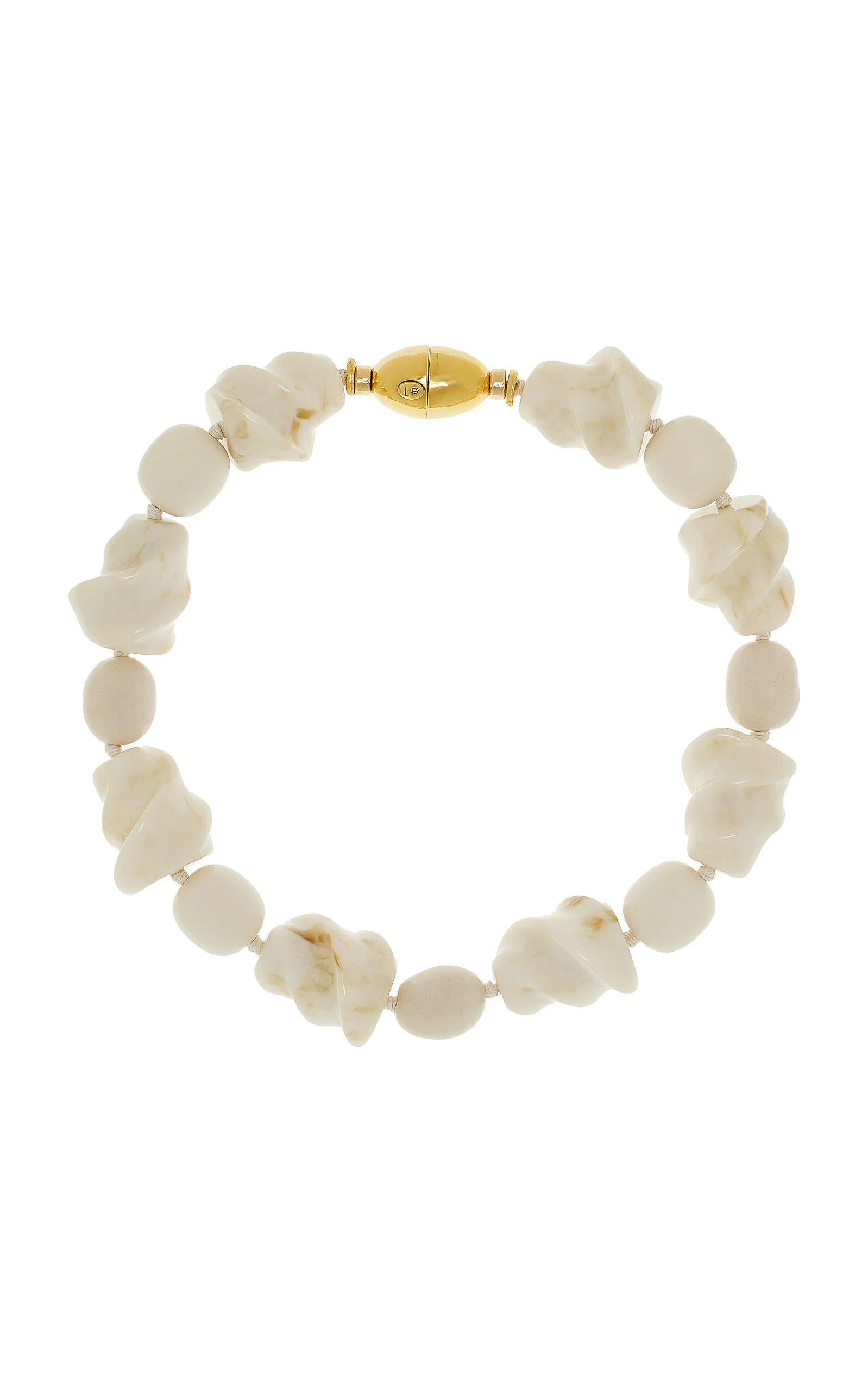 Using an eclectic mix of found materials, Lizzie Fortunato creates statement jewelry imbued with a warm optimism. This season's lineup offers jolts of uplifting color that can easily be dressed up or down. Ivory-colored spiral and oval resin and handmade porcelain bead necklace with gold-plated brass bead-shaped closure. PRODUCT DETAILS - Push closure - Composition: resin, porcelain bead, gold-plated brass - Made in the USA SIZE & FIT - Length: 17.5"