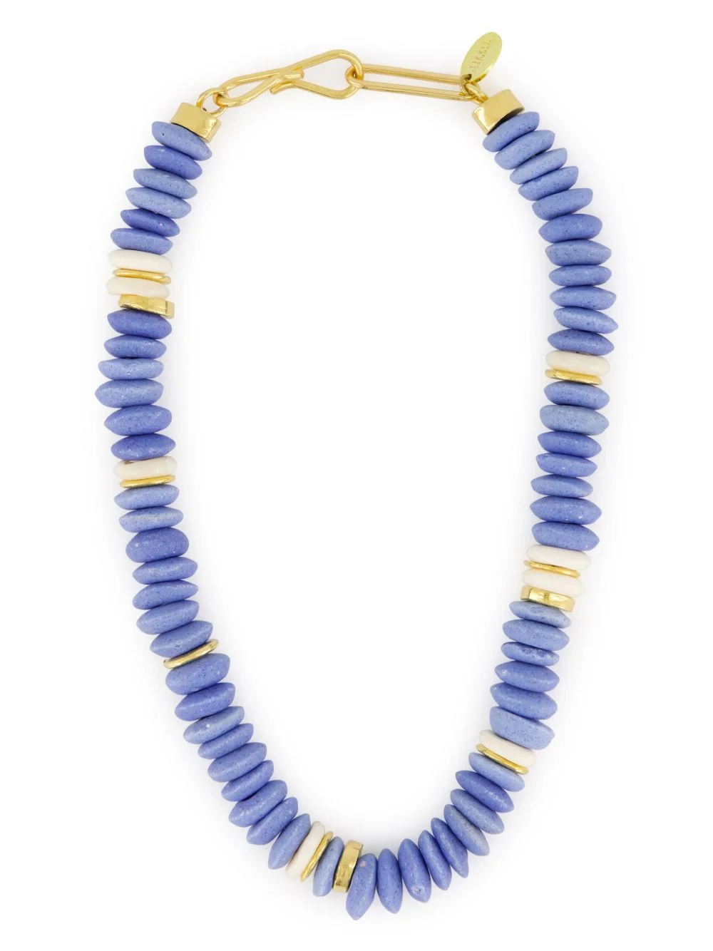 Laguna bead necklace Highlights - Sky blue/gold-tone - Gold-plated brass/recycled glass - Rear hook fastening - Ashtanti beads - Gold-plated rondelle beads - Logo charm - Matte finish Imported SIZE & FIT Measurement Length when open 18.5 in(46.9 cm)