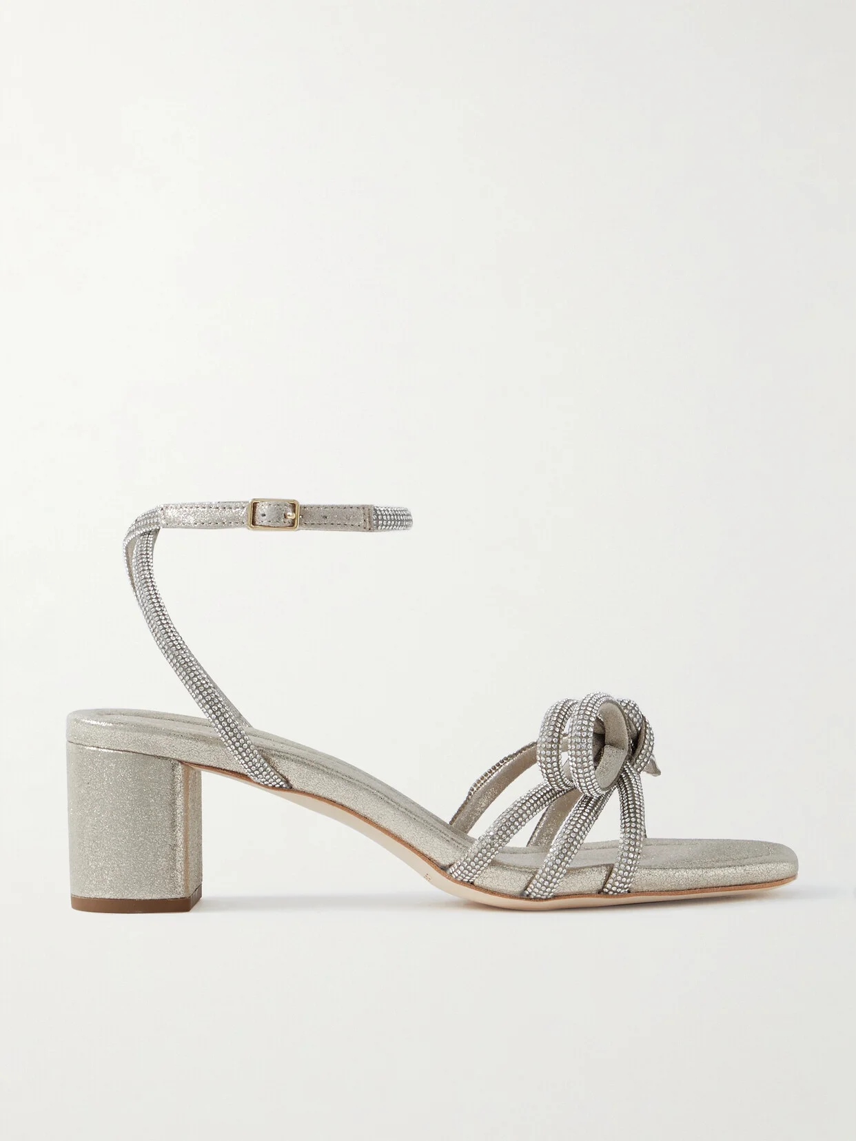 Loeffler Randall's 'Mikel' sandals will work for every event on your social calendar. Set on comfortable block heels, they're made from smooth metallic suede and have crystal embellishments at the signature bow for added sparkle. This product was created using Considered Processes. Find out more about NET SUSTAIN here.