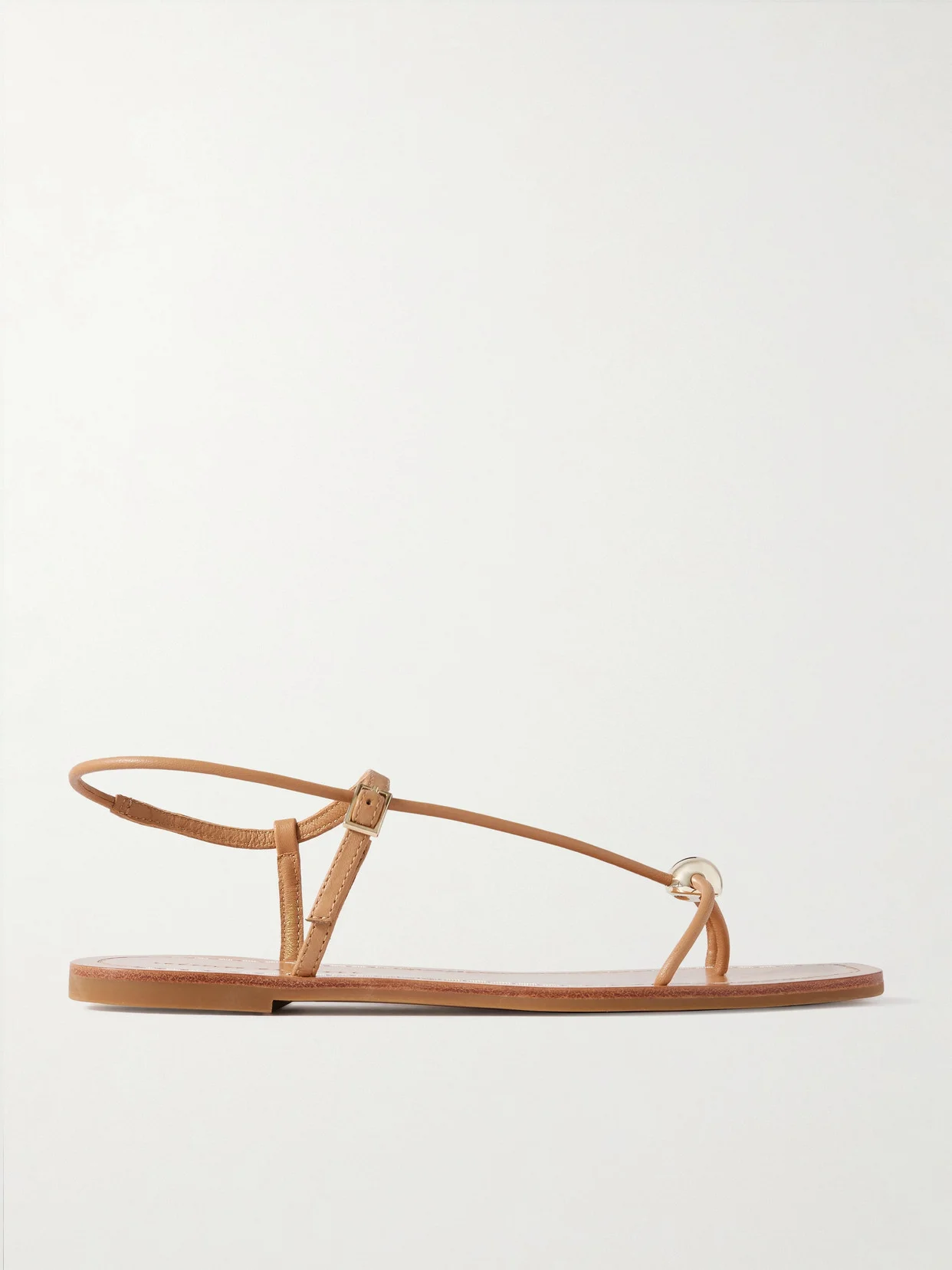 Loeffler Randall's 'Lara' sandals have a pretty, dewy glow thanks to polished gold-tone cabochon on the thong straps. Chic and simple, they're made from leather and elegantly squared at the toe. They're so light to pack and perfect for vacation.