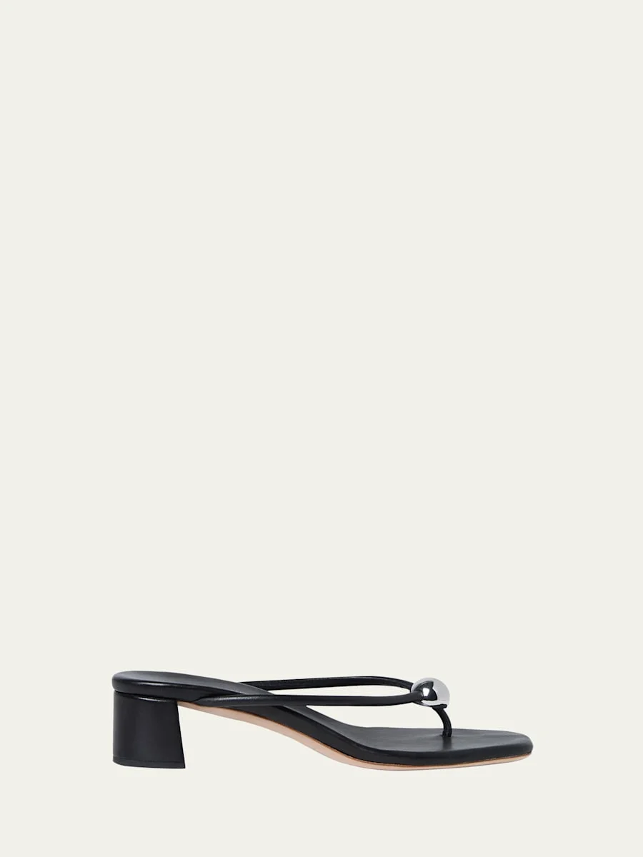 Loeffler Randall "Odessa" leather sandals with a silvertone metal accent 2.00 in / 50 mm block heel Open thong toe Slipon style Leather outsole Lining: Unlined Spot clean, professional cleaning recommended Imported