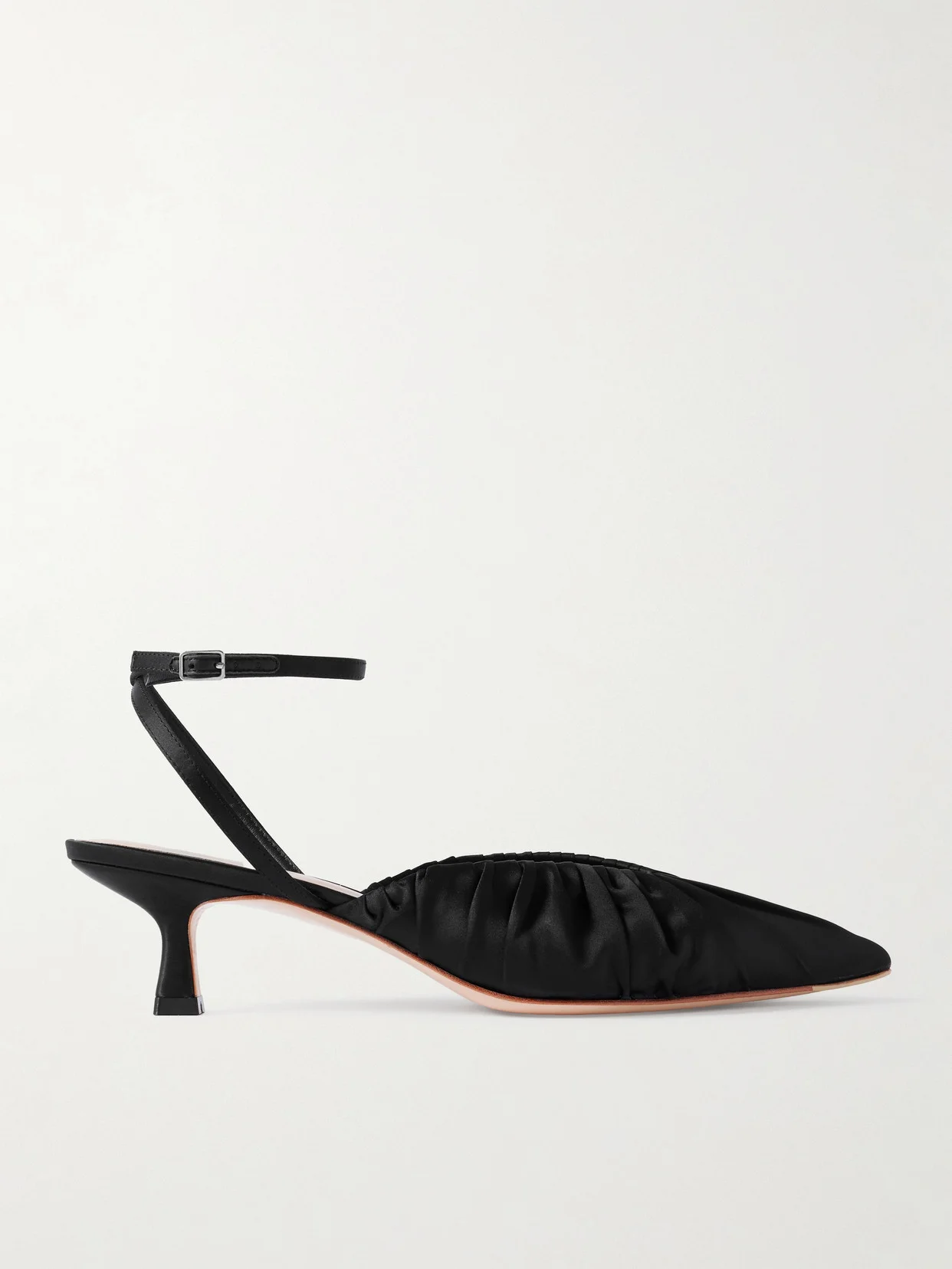 Loeffler Randall's ‘Rio' pumps strike the balance of understated yet glamorous. Made from black satin, they're ruched through the upper and set on a comfortable kitten heel. Style yours with cropped tailoring or slip dresses when you want something sleek but low-effort.