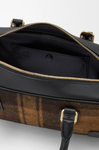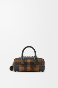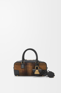 The Amazona displays a classic shape complemented by a signature padlock, here revisited in oversized proportions and complemented by an embossed ladybug-inspired padlock cover and a leaf insect keyfob. This cropped version is crafted in printed tartan suede and nappa calfskin with vintage-finish hardware. - Shoulder, crossbody or hand carry - Detachable and adjustable strap - Zip closure with calfskin pulls - One internal zipped compartment, one slip pocket - Protective metal feet on base - Nappa lambskin lining - Engraved Anagram Colour: Tan/Black Metallic colour: Gold Main material: Suede/Nappa Calf Strap length: 85 - 112 cm Strap drop: 40 - 54 cm Handle drop: 10 cm Weight: 0.538 kg Height: 11 cm Width: 23 cm Depth: 10 cm Made in: Spain
