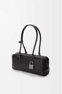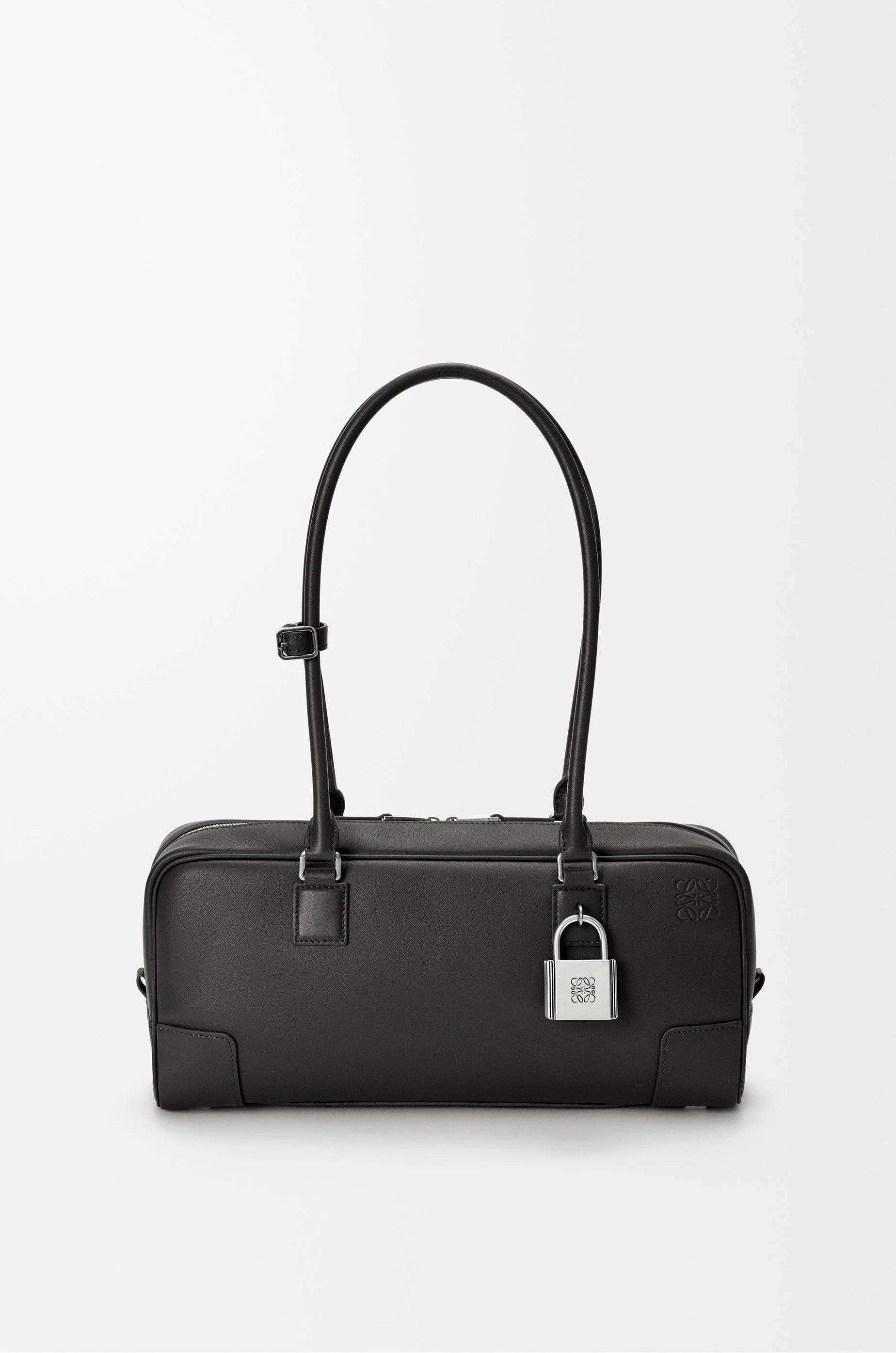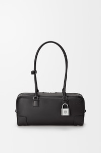 The Amazona displays a classic shape complemented by a signature padlock, here revisited in an elongated bowling bag silhouette to carry on the shoulder thanks to its long handles. This version is crafted in shiny calfskin. - Shoulder or hand carry - Articulated handles with handle fastener - Zip closure with calfskin pulls - One slip pocket - Protective metal feet on base - Gold suede lining - Embossed Anagram Colour: Black Metallic colour: Palladium Main material: Shiny calf Handle drop: 25 cm Weight: 0.59 kg Height: 15 cm Width: 30.5 cm Depth: 9 cm Made in: Spain