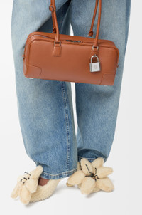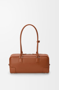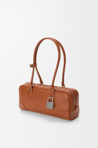 The Amazona displays a classic shape complemented by a signature padlock, here revisited in an elongated bowling bag silhouette to carry on the shoulder thanks to its long handles. This version is crafted in shiny calfskin. - Shoulder or hand carry - Articulated handles with handle fastener - Zip closure with calfskin pulls - One slip pocket - Protective metal feet on base - Gold suede lining - Embossed Anagram Colour: Squirrel Metallic colour: Palladium Main material: Shiny calf Handle drop: 25 cm Weight: 0.59 kg Height: 15 cm Width: 30.5 cm Depth: 9 cm Made in: Spain
