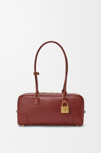 The Amazona displays a classic shape complemented by a signature padlock, here revisited in an elongated bowling bag silhouette to carry on the shoulder thanks to its long handles. This version is crafted in shiny calfskin. - Shoulder or hand carry - Articulated handles with handle fastener - Zip closure with calfskin pulls - One slip pocket - Protective metal feet on base - Gold suede lining - Embossed Anagram Colour: Mahogany Metallic colour: Gold Main material: Shiny calf Handle drop: 25 cm Weight: 0.59 kg Height: 15 cm Width: 30.5 cm Depth: 9 cm Made in: Spain