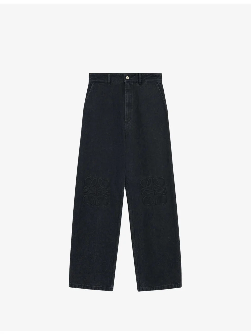 PRODUCT DETAILS - Loewe denim jeans - 100% cotton - Button and zip-fly fastening - Relaxed baggy fit, mid-rise, straight leg, structured waistband with belt loops, five pocket, brand anagram patch at back, dark wash - Machine wash cold - Made in Italy - Model is 5ft 10in/1.78m and wears a size 26 - Midweight, non-stretch Ref: R04493173