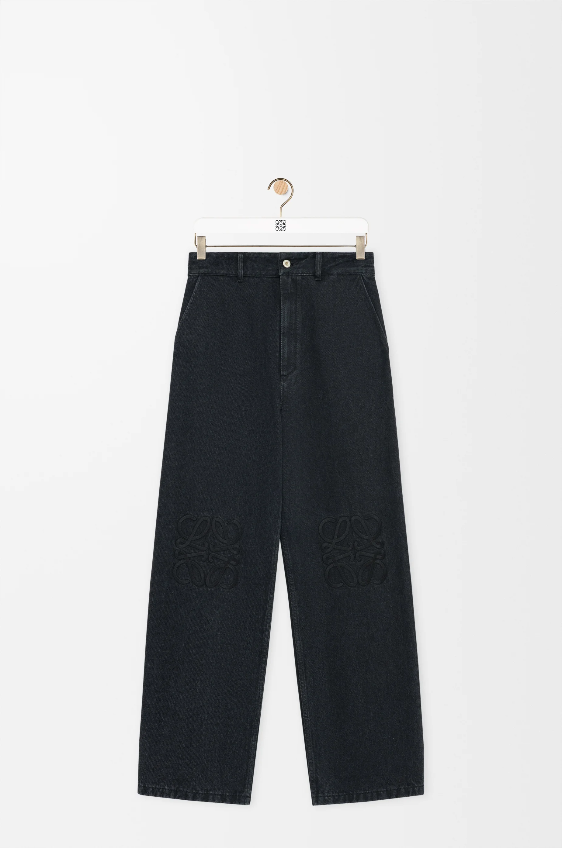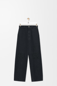 Jeans in medium-weight washed cotton denim featuring Anagram embroideries at the knees. - Relaxed fit, regular length - Mid waist, loose leg - Five pocket style - Concealed button fly - LOEWE embossed leather patch placed at the back Colour: Black Main material: Cotton Weight: 0.9 kg Made in: Italy Materials & care Main Material: 100% cotton