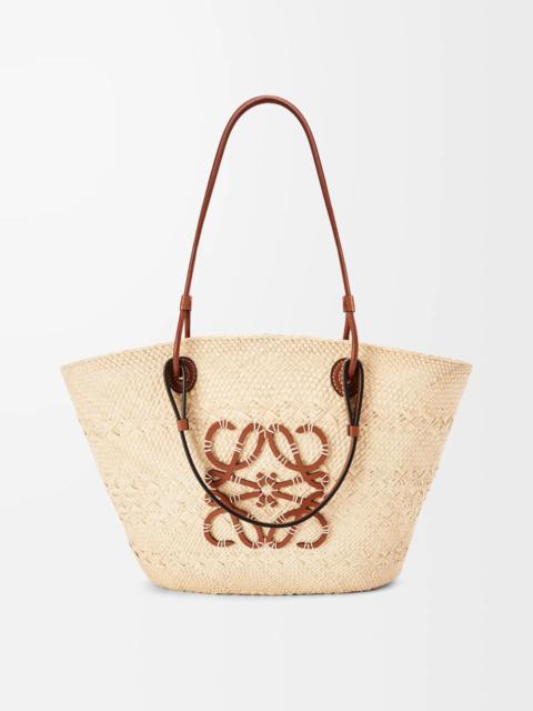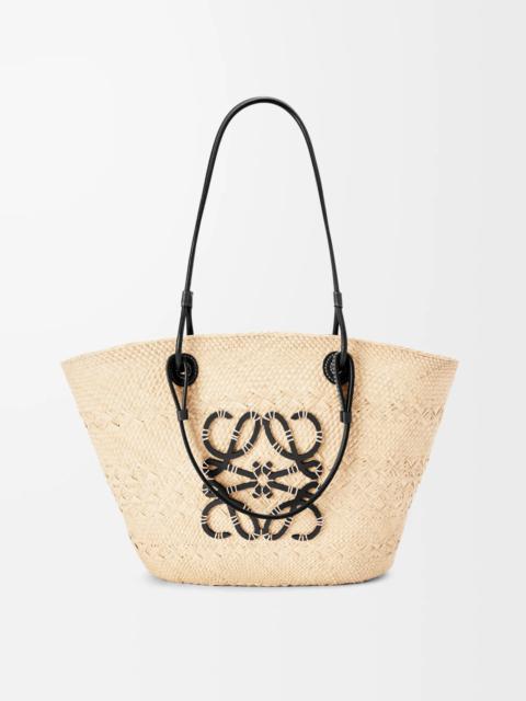 A traditional basket bag with a classic handwoven body, tubular calfskin straps and calfskin top handles and an embroidered calfskin Anagram. This version is crafted in iraca palm which is cultivated, harvested, and sun-dried in Colombia where it is then woven by women artisans from Corporación Oficio y Arte, an organisation guided by fair trade principles. - Shoulder or top handle carry - Calfskin tie closure - Customisable with strap and personalised charms - Unlined - Due to its handcrafted nature, sizes may differ slightly, making every purchase unique Details - Colour: Natural/Black - Main material: Iraca Palm/Calf - Handle drop: 15-30 cm - Weight : 0.26 kg - Height (cm): 24.5 - Width (cm): 46 - Depth (cm): 16 - Height (inch): 9.6 - Width (inch): 18.1 - Depth (inch): 6.3 - Model ID: A223T43X02 - CIL: 0010698199 - Made in: Spain