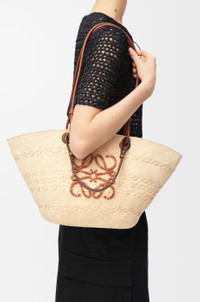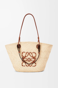A traditional basket bag with a classic handwoven body, tubular calfskin straps and calfskin top handles and an embroidered calfskin Anagram. This version is crafted in iraca palm which is cultivated, harvested, and sun-dried in Colombia where it is then woven by women artisans from Corporación Oficio y Arte, an organisation guided by fair trade principles. - Shoulder or top handle carry - Calfskin tie closure - Customisable with strap and personalised charms - Unlined - Due to its handcrafted nature, sizes and colour may differ slightly, making every purchase unique Details - Colour: Natural/Tan - Main material: Iraca Palm/Calf - Handle drop: 15-30 cm - Weight: 0.26 kg - Height (cm): 24.5 - Width (cm): 46 - Depth (cm): 16 - Height (inch): 9.6 - Width (inch): 18.1 - Depth (inch): 6.3 - Model ID: A223T43X02 - CIL: 0010562767 - Made in: Spain