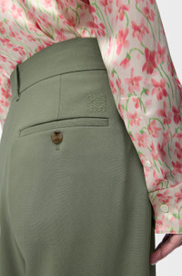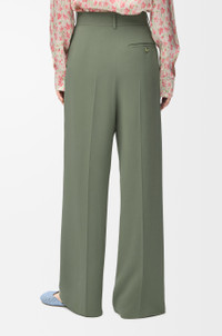 Trousers in lightweight fluid viscose stretch cady. - Regular fit, regular length - Mid waist, straight leg - Concealed hook fastening and zip fly - Seam pockets, buttoned rear welt pocket - Pressed creases at the front and back - Anagram embroidery placed at the back Colour: Light Khaki Green Main material: Viscose/Elastan Weight: 0.25 kg Made in: Italy Materials & care Main Material: 96% viscose 4% elastane
