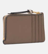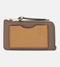 All of Loewe's leather goods are handcrafted in Spain, reflecting the house's centuries-long expertise and artisanal methods. This card case showcases the signature flair for craftsmanship with a grained leather construction and an Anagram-embossed card slot on the front. Product Details - Material: calf leather - Lining: calf leather - Made in Spain - Designer color name: Taupe/Gold - Item color: brown - Hardware color: gold - Closure: zipped top - Internal details: Card slots, coin pocket - Includes: dust bag, box - Item number: P01117841 Size & Fit - Height 7,5cm-3" - Width 13cm-5"