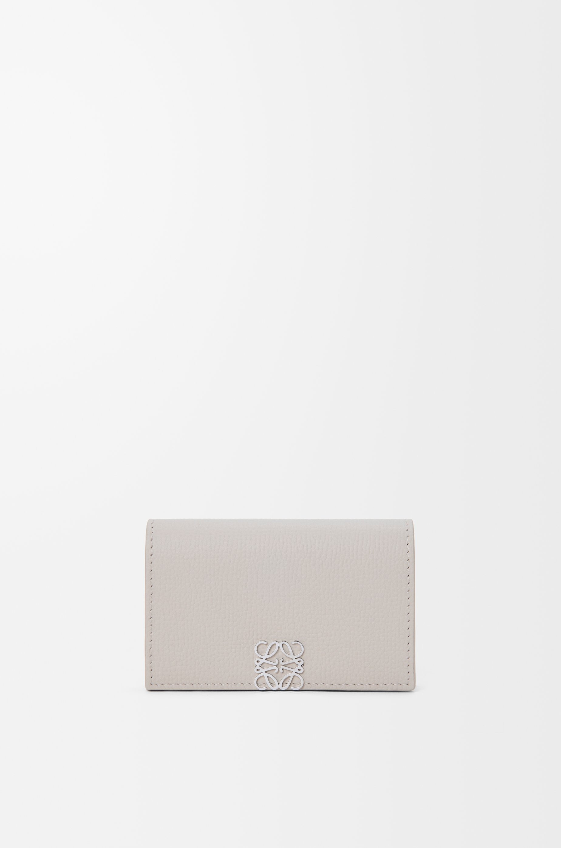 Business cardholder in pebble grained calfskin. - One main compartment, one card slot - Snap button closure - Calfskin lining - Gold or silver-finish metal Anagram Colour: Light Ghost Metallic colour: Palladium Main material: Pebble Grain Calf Weight: 0.05 kg Height: 7 cm Width: 10.8 cm Depth: 2 cm Made in: Spain