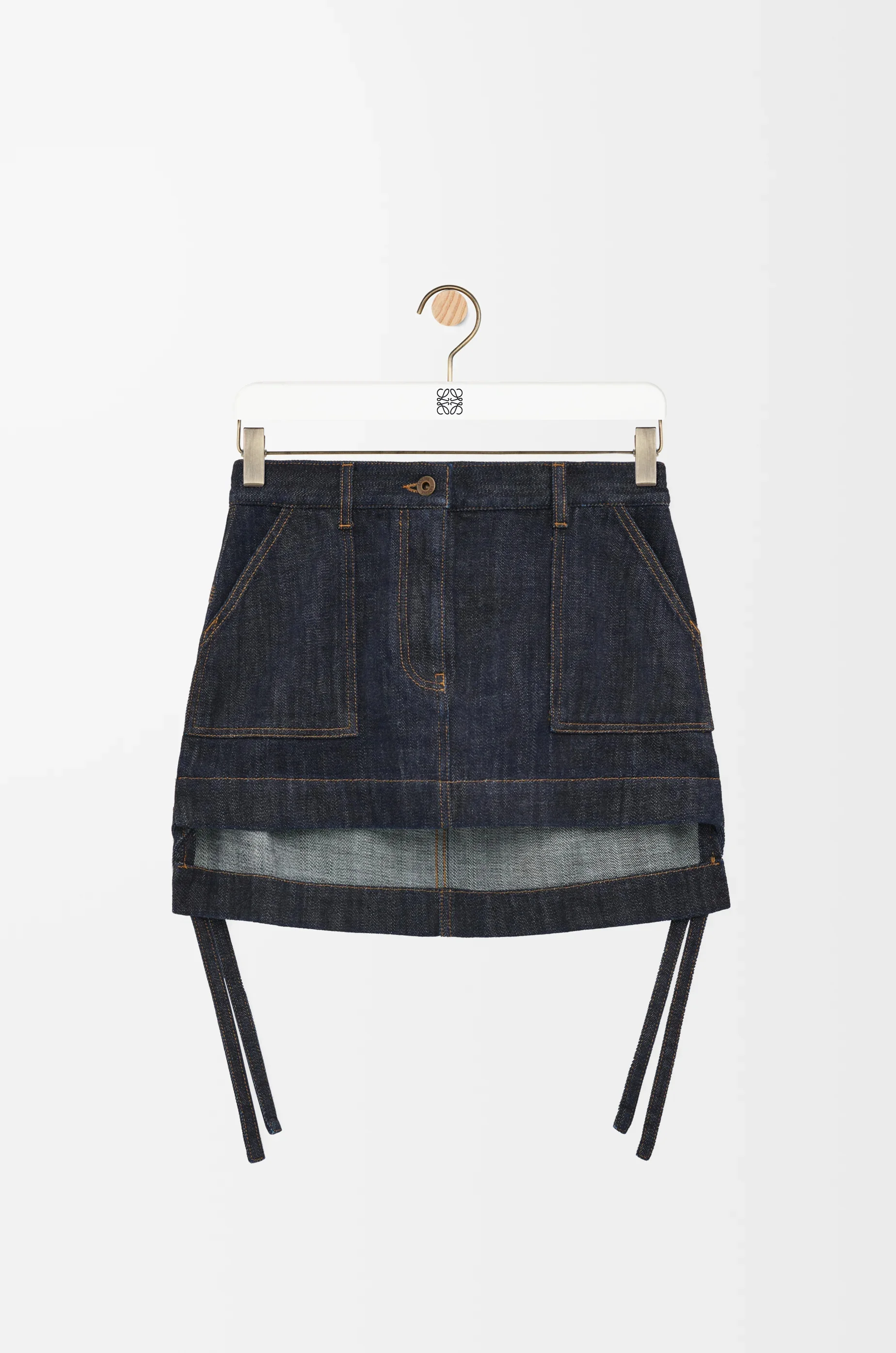 Skirt in medium-weight raw broken twill featuring asymmetric front to back hem with ties at the side. - Regular fit, mini length - Mid waist - Concealed zip fastening - Patch pockets - Signature four-row topstitching - LOEWE Anagram embossed leather patch pocket placed at the back Details - Colour : Indigo Blue - Main material : Cotton - Weight : 0.45 kg - Model ID : S359Y1EX19 - Made in : Italy