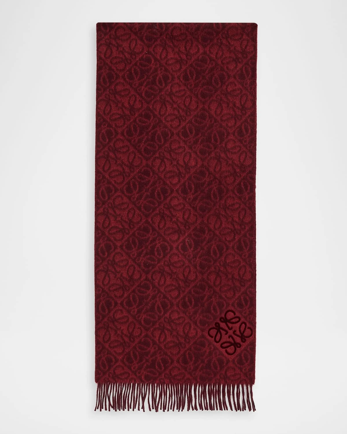 Loewe woolblend scarf printed in classic monogram motif Approx. 14.96"W × 70.87"L Fringe trim Can be styled in multiple ways Wool/cashmere Professional cleaning recommended Made in United Kingdom