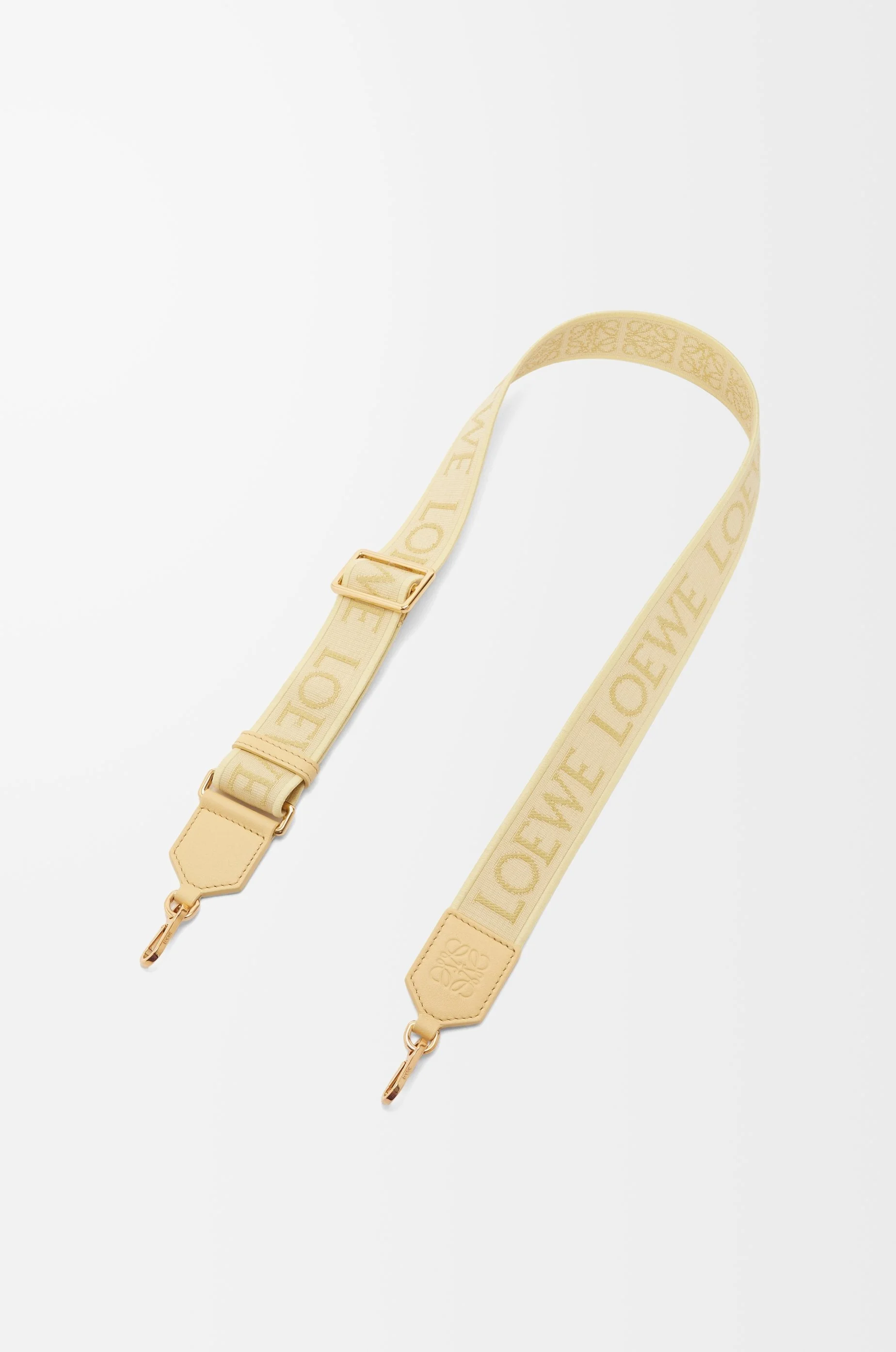 Detachable strap crafted in calfskin and jacquard with a LOEWE pattern on one side and an Anagram pattern on the reverse. - 4cm wide - Hook fastenings and a slider in a gold finish - Detachable and adjustable - Embossed Anagram Details - Colour: Vanilla - Metallic colour: Gold - Main material: Jacquard/Calf - Strap length: 65 - 105 cm - Weight: 0.13 kg - Height (cm): 0.2 - Width (cm): 65 - Depth (cm): 4 - Height (inch): 0.1 - Width (inch): 25.6 - Depth (inch): 1.6 - Model ID: C604T87X32 - CIL: 0010965358 - Made in: Spain