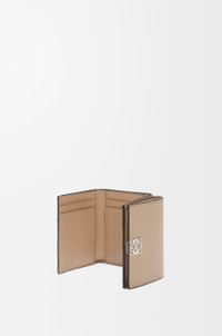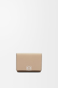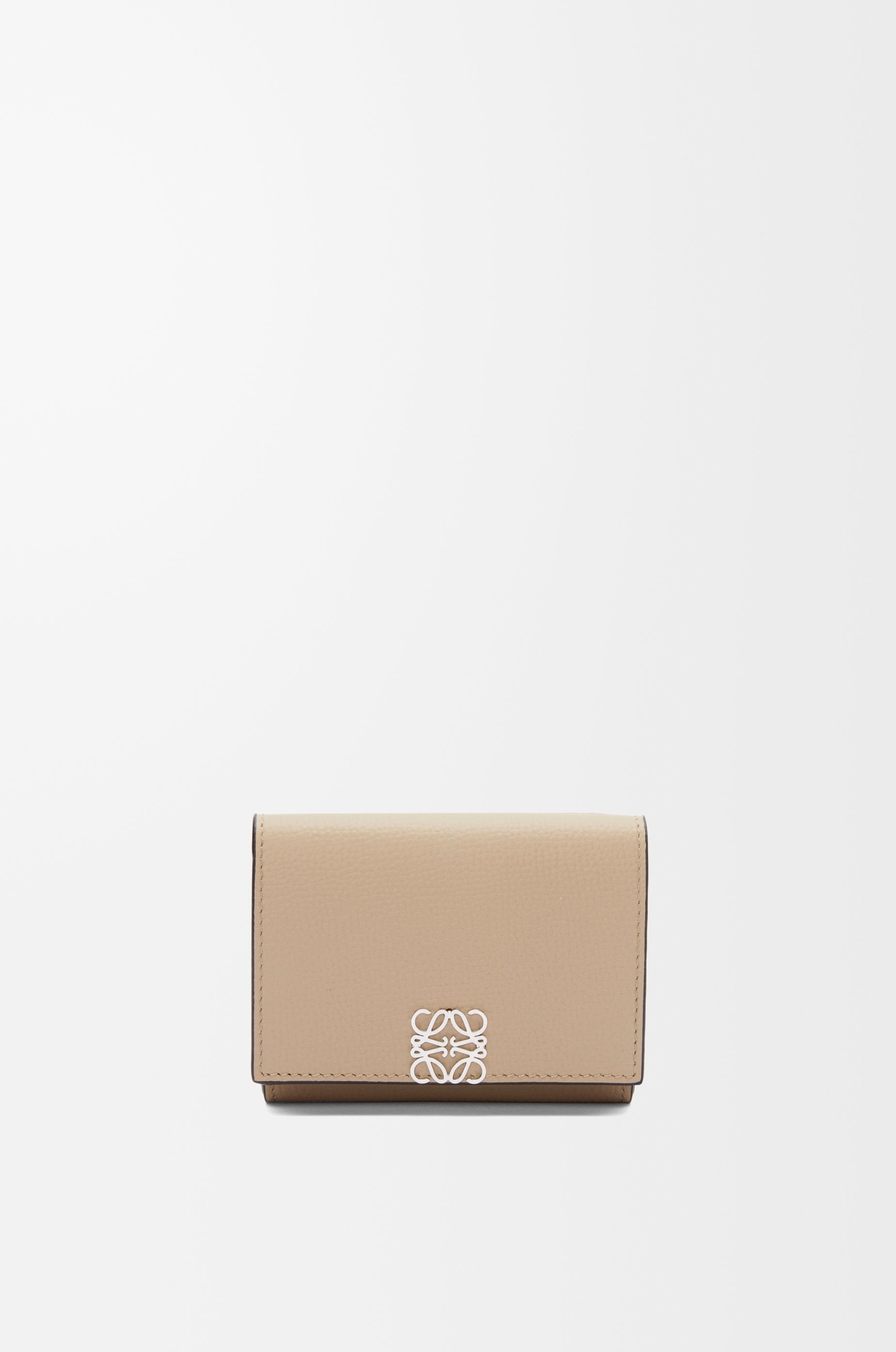 Trifold wallet in pebble grained calfskin. - Six card slots, one large pocket, one coin compartment - Snap button closure - Calfskin lining - Silver-finish metal Anagram Colour: Sand Metallic colour: Palladium Main material: Pebble Grain Calf Weight: 0.1 kg Height: 7.8 cm Width: 10.2 cm Depth: 3.8 cm Made in: Spain