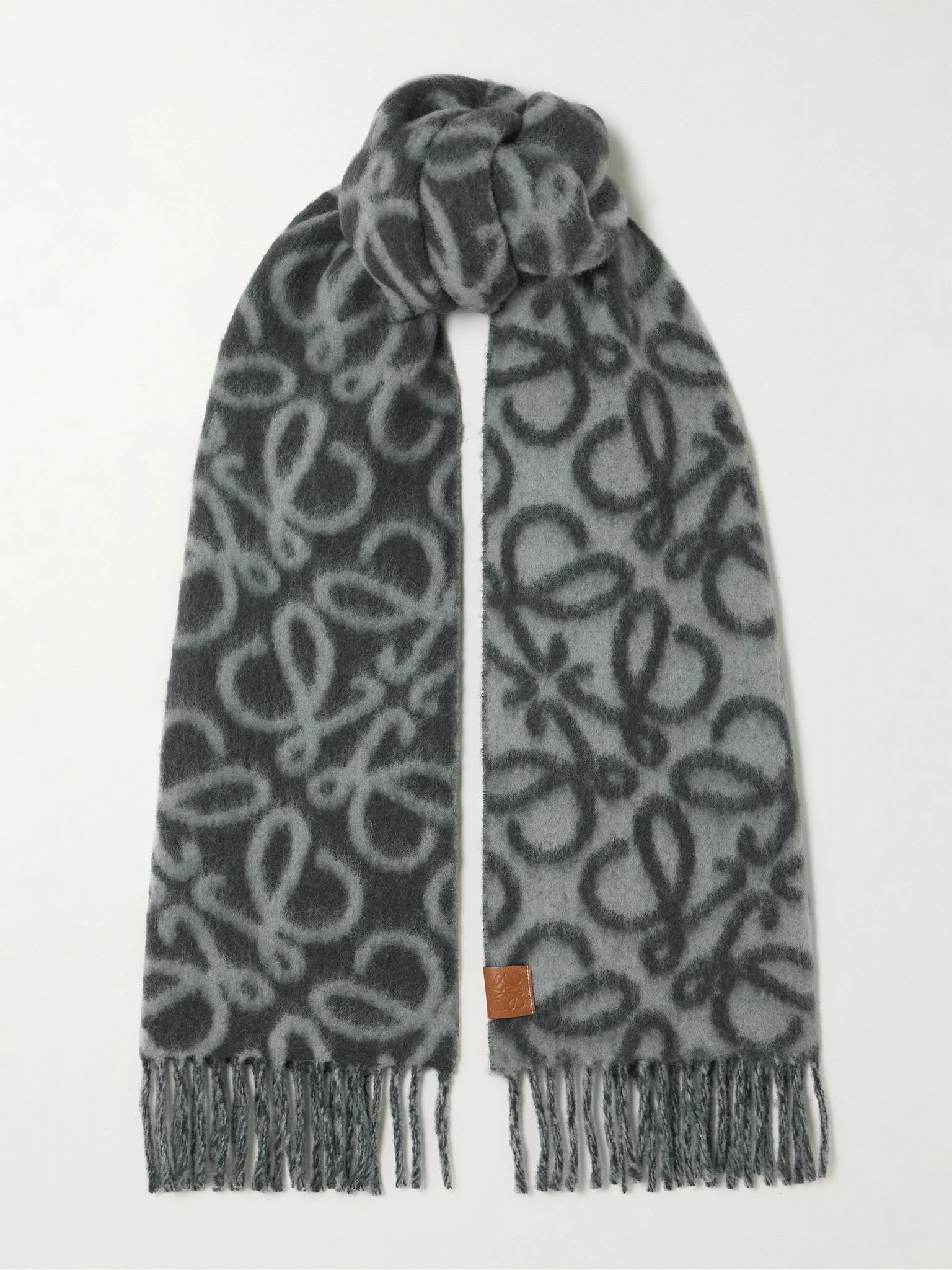 Loewe's 'Anagram' logo was created in the '70s by Vicente Vela, then given a modern refresh when Jonathan Anderson took the helm. Made from slightly fluffy jacquard-knit, this scarf has a fringe trim and a signature leather tab. Details & Care - Tonal-gray jacquard-knit - 45% alpaca, 34% wool, 21% polyamide; trim: 100% leather (Calf) - Dry clean