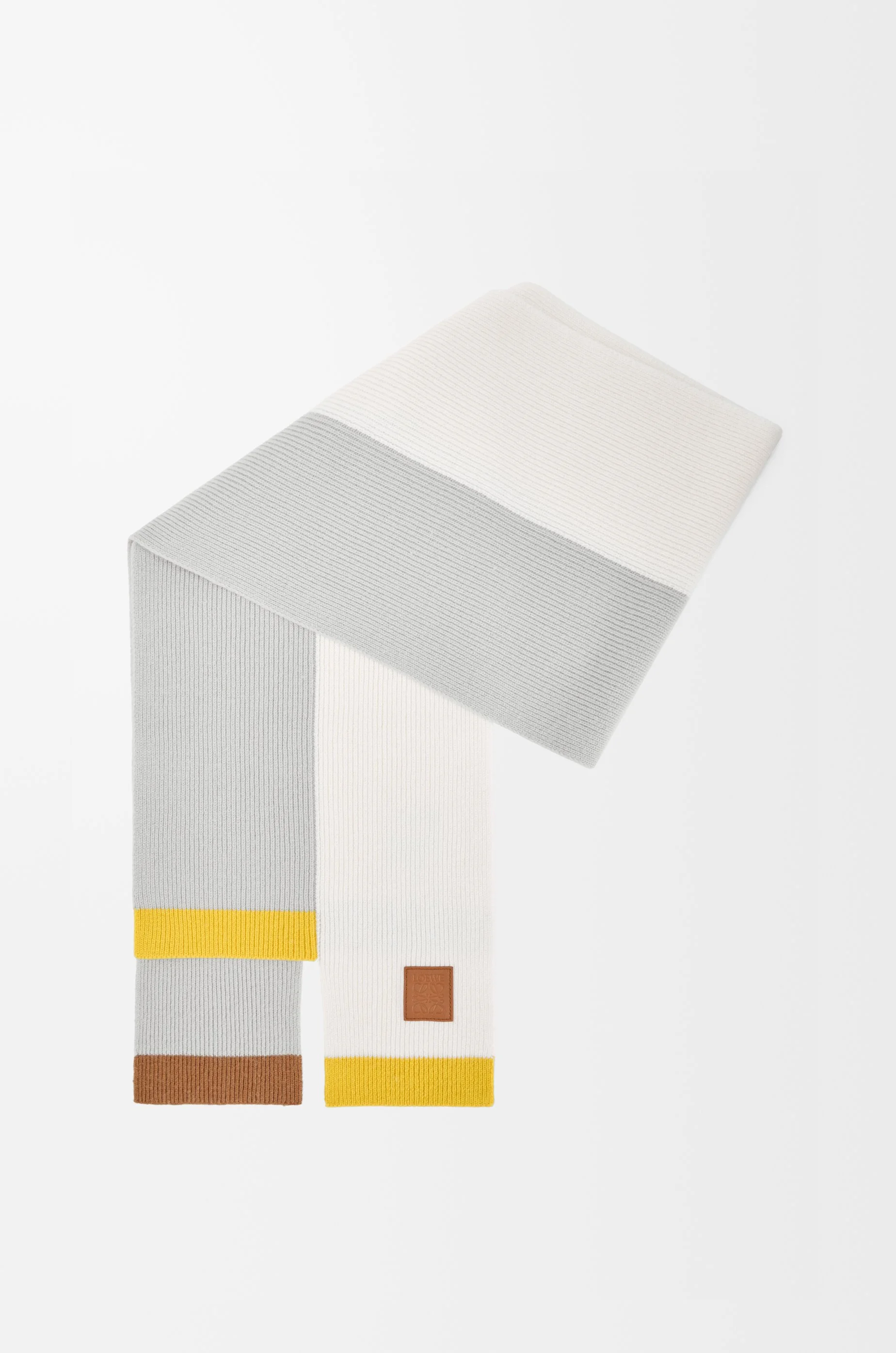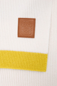 Scarf in medium-weight ribbed wool featuring an asymmetric design with contrast edges. - 30cm x 182 cm - Rib stitch - LOEWE embossed leather patch placed at the corner Colour: Mustard/Bronze Main material: Wool Weight: 0.278 kg Height: 189 cm Width: 30 cm Made in: Italy