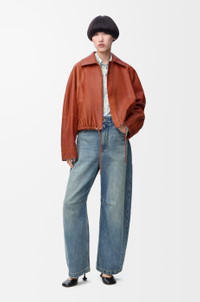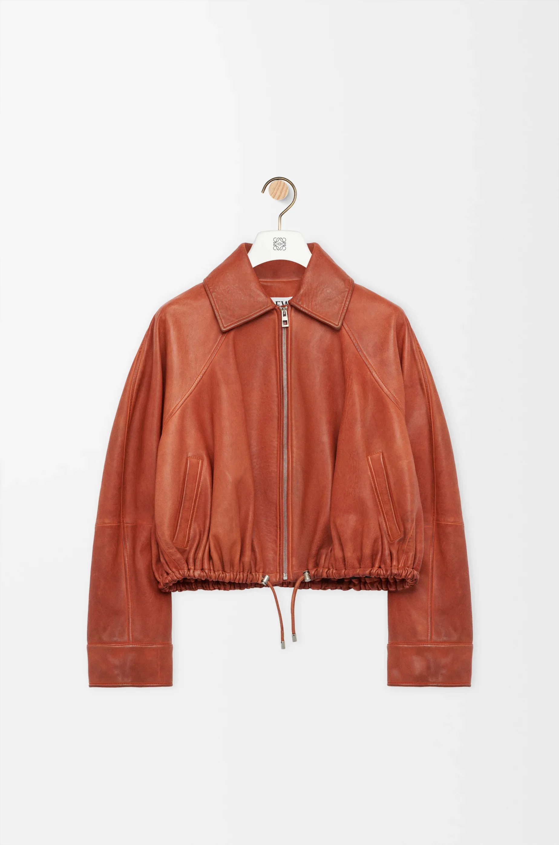 Jacket in lightweight vintage-effect nappa lambskin featuring a balloon silhouette with an adjustable drawstring hem. - Relaxed fit, regular length - Classic collar - Zip front fastening with a leather puller - Welt pockets - Fully lined - LOEWE Anagram embossed patch placed at the back Colour: Orange Main material: Nappa Weight: 1.6 kg Made in: Italy Materials & care Main Material: 100% lambskin