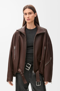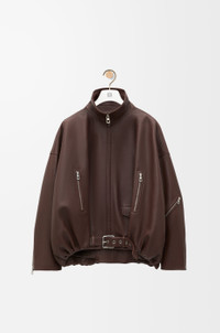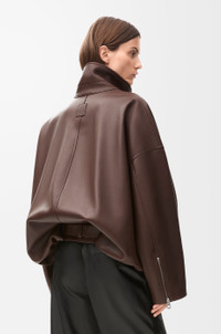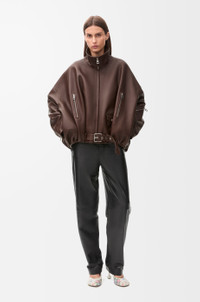 Jacket crafted in medium-weight mellow nappa lambskin with a buttery touch. - Relaxed fit - Regular length - Balloon silhouette - High neck - Zip front fastening - Zipped pockets at the front and on the left sleeve - Small buttoned flap pocket - Inside welt pocket - Partially concealed belt with LOEWE engraved buckle - Fully lined - LOEWE Anagram embossed leather patch placed at the back Details - Colour : Dark Chocolate - Main material : Nappa - Weight : 1.8 kg - Model ID : S540Y34L18 - Made in : Spain