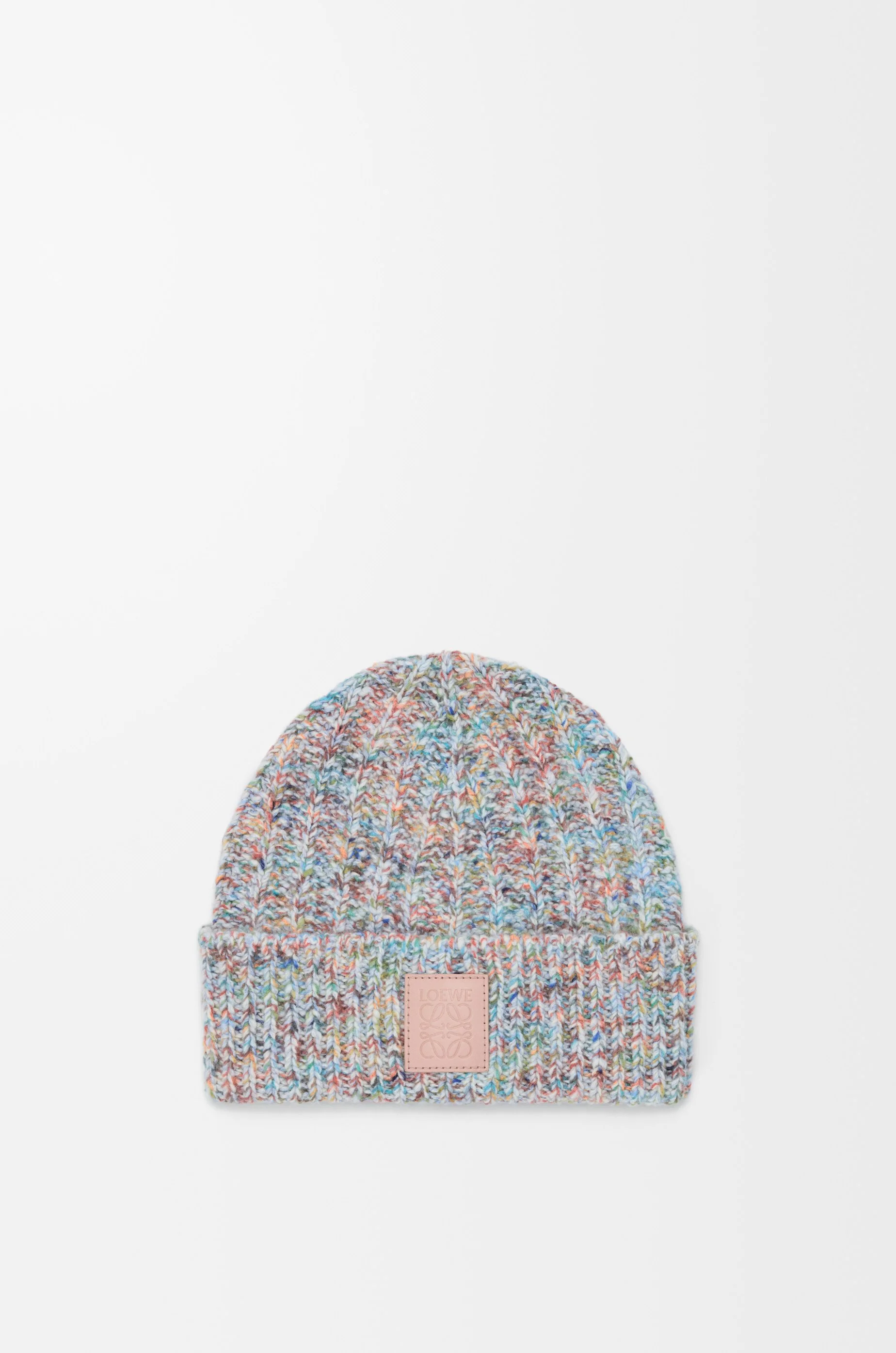 Beanie in medium-weight speckled wool and cashmere blend. - Regular length - Rib stitch with mixed fantasy yarn - Turn-up cuff - LOEWE Anagram embossed leather patch placed at the front Colour: Multicolor Main material: Wool/Cashmere Weight: 0.08 kg Made in: Italy
