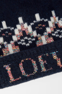 Beanie in medium-weight ribbed wool blend featuring a Fair Isle intarsia pattern with a sequin yarn. - Regular length - Turn-up cuff - LOEWE intarsia placed at the front Colour: Navy/Multicolor Main material: Wool/polyamide Weight: 0.071 kg Made in: Italy