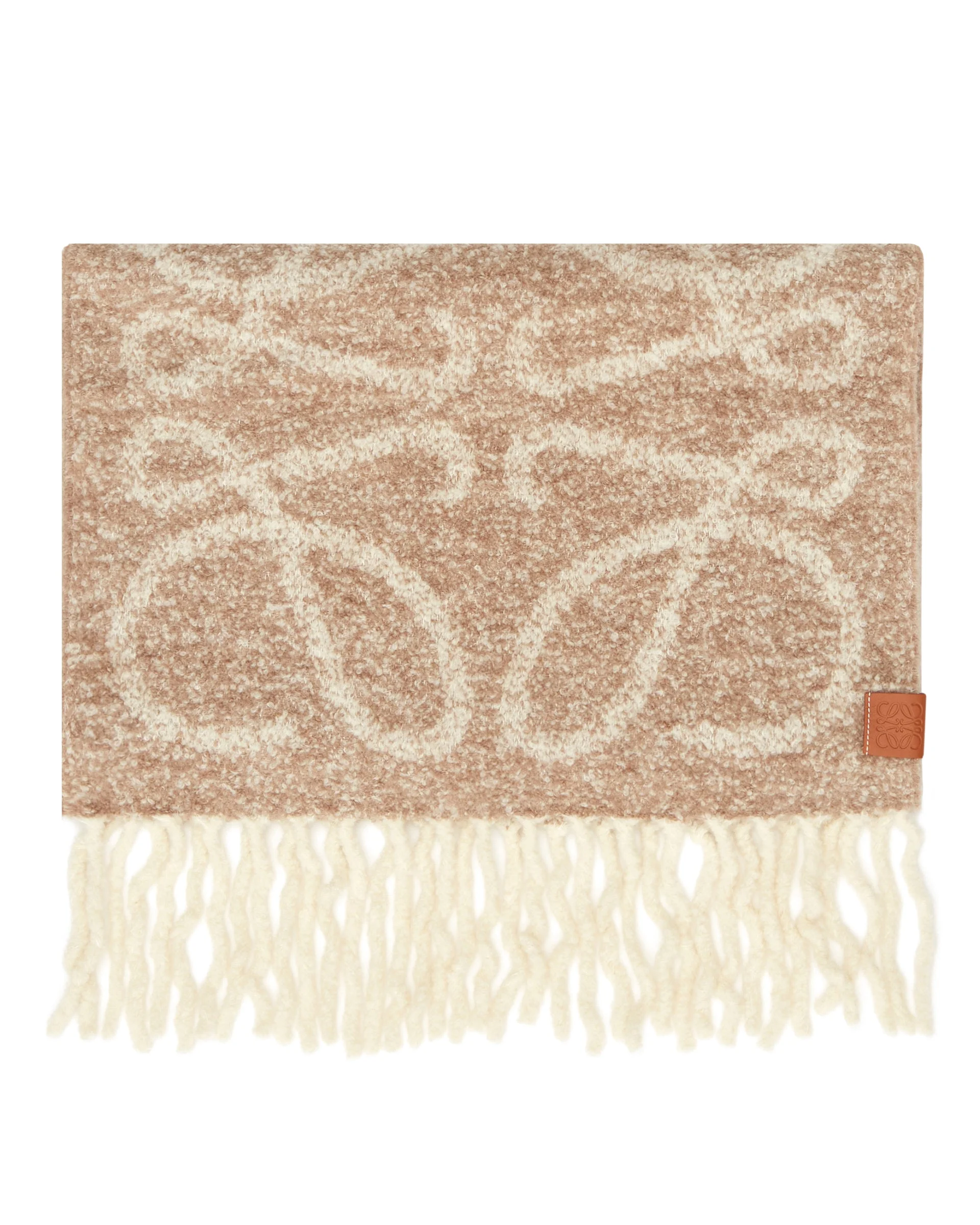 Loewe Beige Anagram Scarf. Beige alpaca and wool blend, Anagram motif, leather Anagram patch. Frayed edges. DETAILS Model: F811257X792147 Composition: 60% Alpaca, 25% Wool, 15% Polyamide; Detail: 100% Leather Made in: ITALY Season: SS26