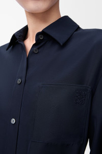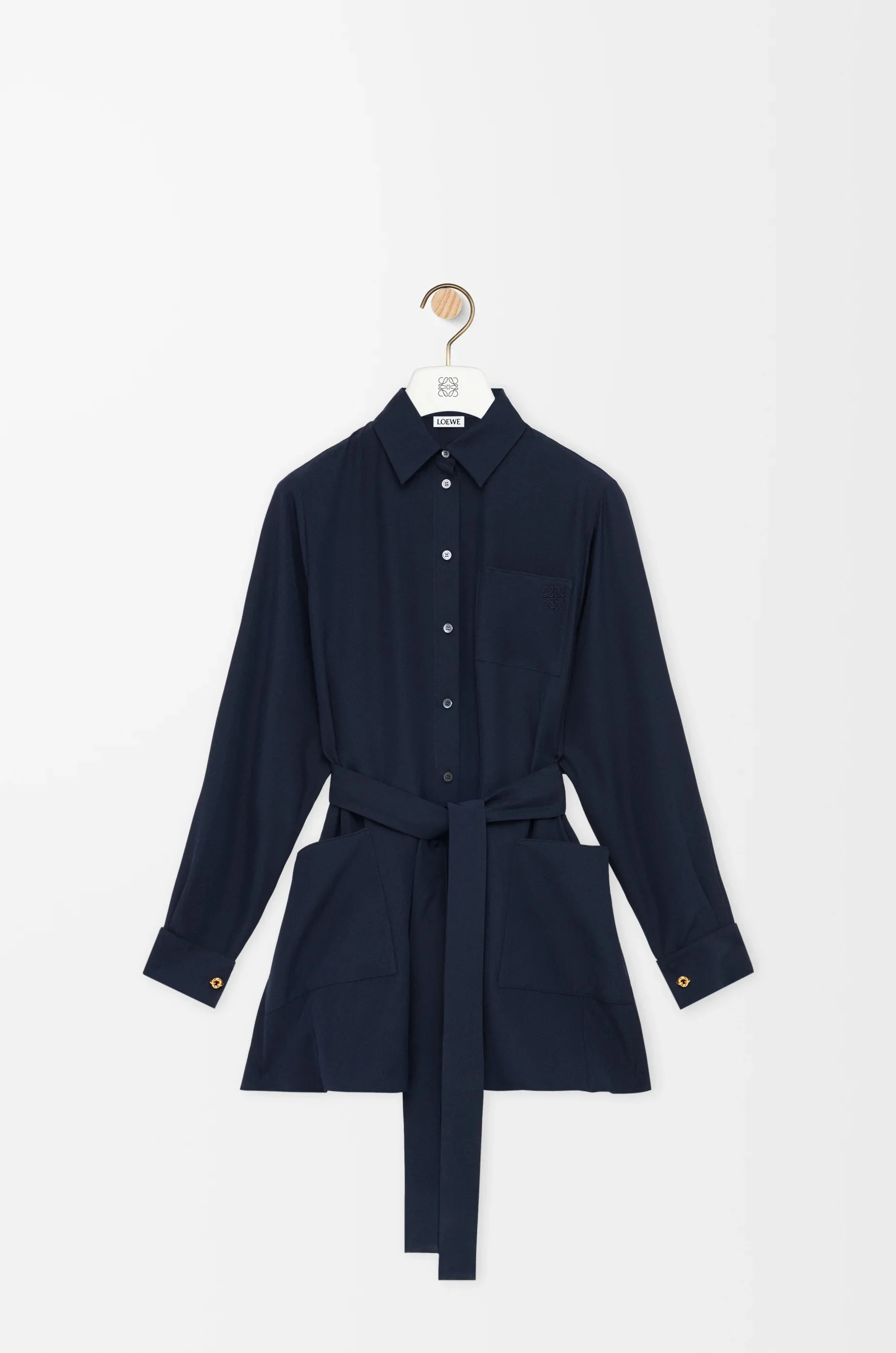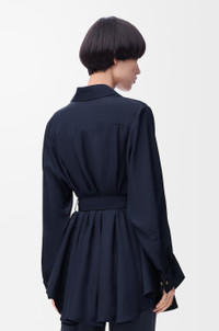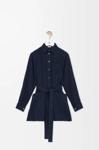 Blouse in lightweight matte silk crepe featuring a self-tie belt at the waist and donut chain cuff links. - Relaxed fit, long length - Classic collar - Button front fastening - Chest patch pocket - Anagram embroidery placed on the belt Colour: Navy Blue Main material: Silk Weight: 0.25 kg Made in: Italy Materials & care Main Material: 100% silk