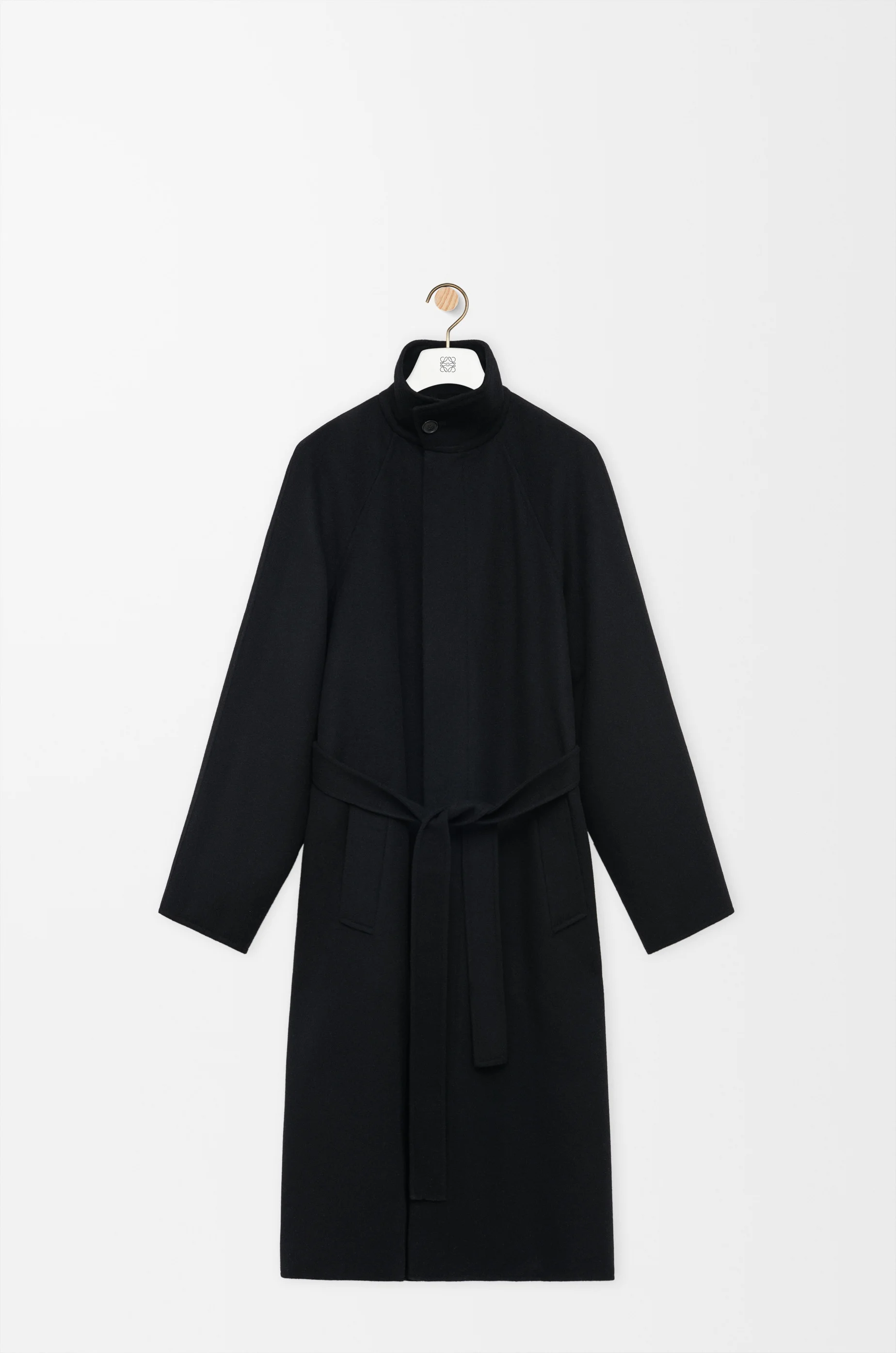 Coat in lightweight double face wool and cashmere featuring a single-breasted construction, raglan sleeves and a self-tie fabric belt. - Regular fit, mid length - High collar - Concealed button front fastening - Welt pockets - Back vent - LOEWE embossed leather patch placed on the belt Colour: Black Main material: Wool/Cashmere Weight: 0.51 kg Made in: Italy Materials & care Main Material: 90% wool 10% cashmere