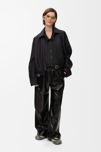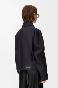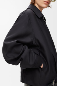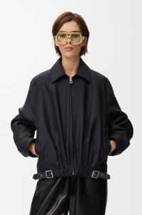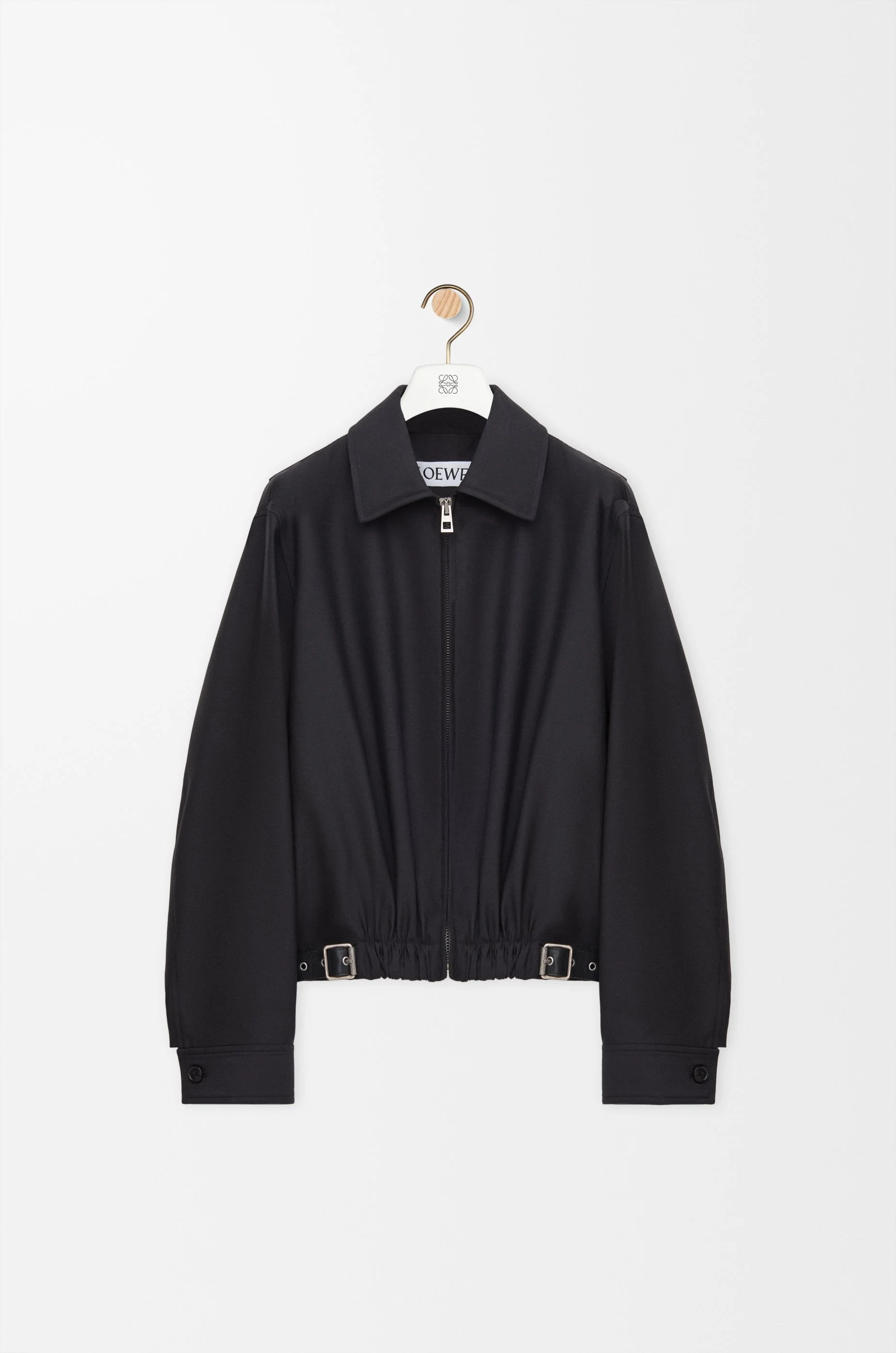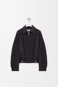 Jacket in medium-weight wool and silk tailoring featuring a gathered front with a leather belt detail. - Regular fit, regular length - Classic collar - Zip front fastening, buttoned cuffs - Seam pockets, inside jet pocket - Fully lined - LOEWE embossed leather patch placed at the back Colour: Black Main material: Wool/Silk Weight: 0.7 kg Made in: Italy Materials & care Main Material: 71% wool 29% silk