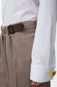 Shorts in lightweight fluid wool tailoring featuring a gathered front with a leather belt detail. - Regular fit, knee length - Mid waist - Side zip fastening - Seam pockets, buttoned rear jet pocket - Pressed creases at the front - LOEWE embossed leather patch placed at the back Colour: Beige Melange Main material: Wool Weight: 0.35 kg Made in: Italy Materials & care Main Material: 100% wool
