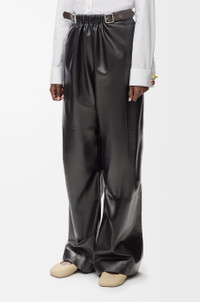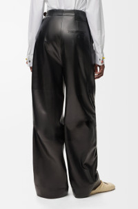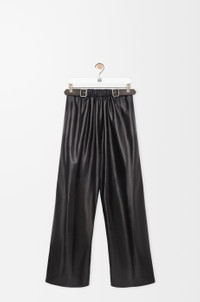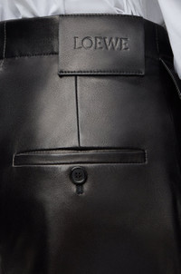Trousers in lightweight nappa plonge lambskin featuring a gathered front with a contrast leather belt detail. - Regular fit, regular length - Mid waist, straight leg - Side zip fastening - Seam pockets, buttoned rear jet pocket - Pressed creases at the front - Partially lined - LOEWE embossed leather patch placed at the back Colour: Black Main material: Nappa Weight: 0.8 kg Made in: Italy Materials & care Main Material: 100% lambskin