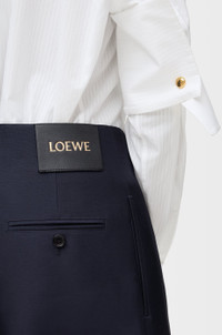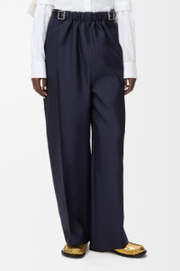 Trousers in medium-weight wool and silk tailoring featuring a gathered front with a leather belt detail. - Regular fit, regular length - Mid waist, straight leg - Side zip fastening - Seam pockets, buttoned rear jet pocket - Pressed creases at the front - LOEWE embossed leather patch placed at the back Colour: Navy Blue Main material: Wool/Silk Weight: 0.5 kg Made in: Italy Materials & care Main Material: 71% wool 29% silk