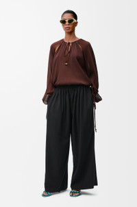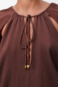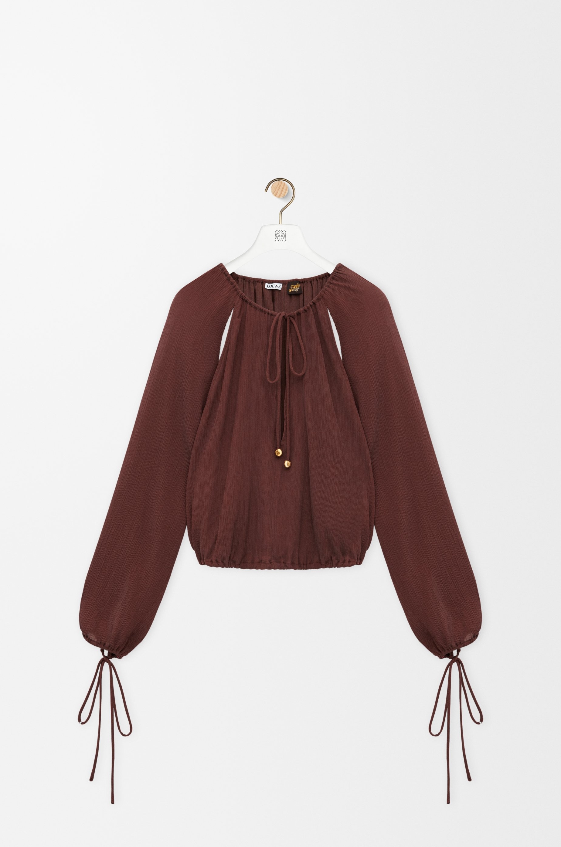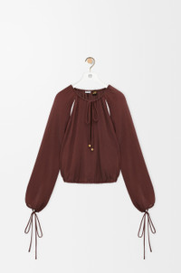 Blouse in lightweight cotton and silk crepon featuring adjustable ties with an Anagram Pebble embellishment at the collar. - Relaxed fit, regular length - V-neck - Slits at the shoulders - Gathered drawstrings at the cuffs and hem Colour: Coffee Main material: Cotton/Silk Weight: 0.3 kg Made in: Spain