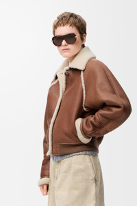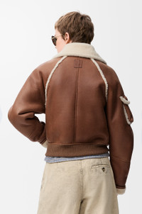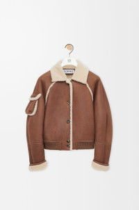 Jacket in medium-weight curly merino shearling featuring a balloon silhouette with curved sleeves. - Regular fit, short length - Shearling collar - Raglan sleeves with shearling-covered seams - Button front fastening - Snap button flap pocket on the sleeve, seam pockets - LOEWE Anagram embossed patch placed at the back Colour: Brown Main material: Shearling Weight: 1.0 kg Made in: Spain