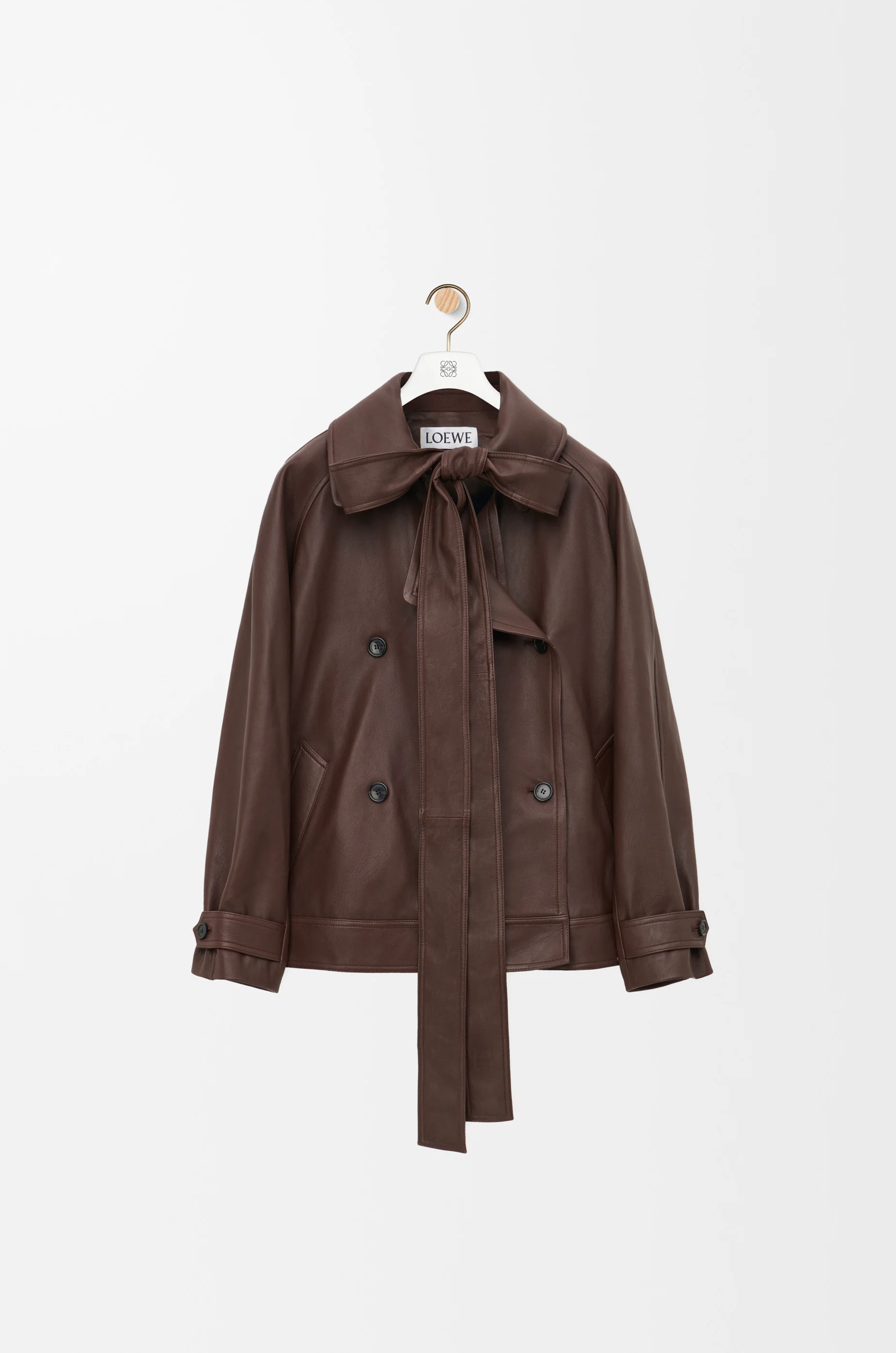 Jacket crafted in medium-weight nappa lambskin. - Relaxed fit - Regular length - Double-breasted - Removable lavallière bow - Buttoned cuffs with Anagram Pebble buttons - Button front fastening - Adjustable waist tabs - Horn buttons - Fully lined Details - Colour : Dark Chocolate - Main material : Nappa - Weight : 1.2 kg - Model ID : S359Y34L22 - Made in : Spain