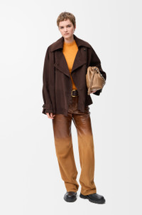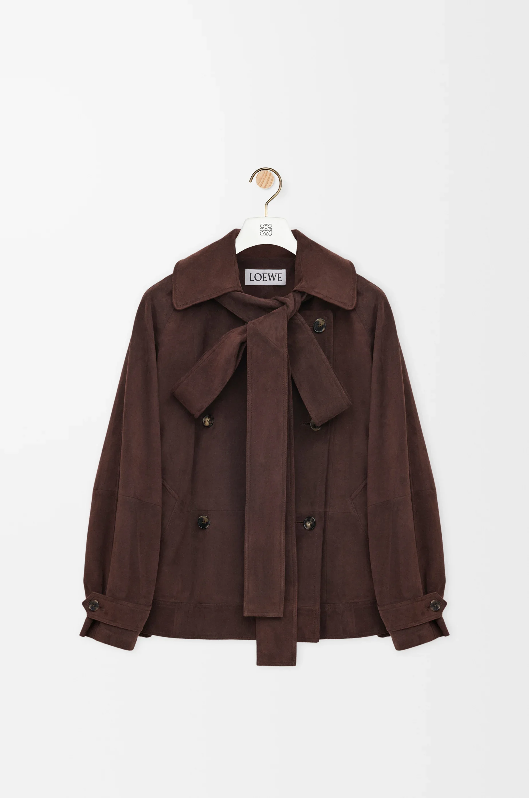 Jacket in lightweight suede goatskin featuring a double-breasted construction and a removable lavalliere bow. - Relaxed fit, regular length - Button front fastening - Buttoned tabs at the waist and cuffs - Fully lined Colour: Brown Main material: Suede Weight: 1.62 kg Made in: Spain Materials & care Main Material: 100% goat skin