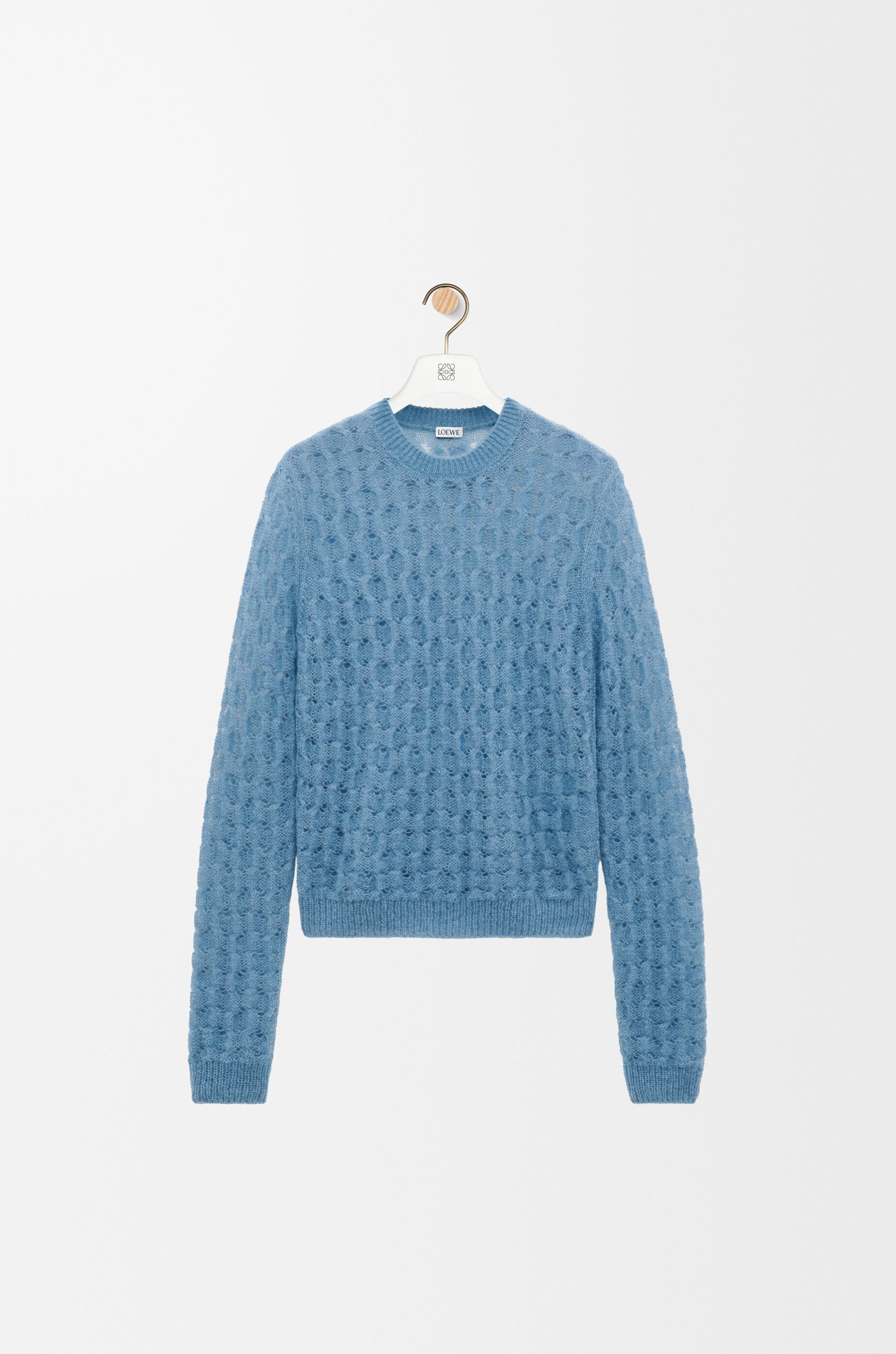 Sweater in lightweight mohair and wool blend. - Regular fit, regular length - Reverse cable stitch - Round neck - Ribbed collar, cuffs and hem - Anagram embossed leather tab placed at the side Details - Colour : Light Blue - Main material : Mohair/Polyamid/Wool - Weight : 0.1 kg - Model ID : S540Y14KG7 - Made in : Italy