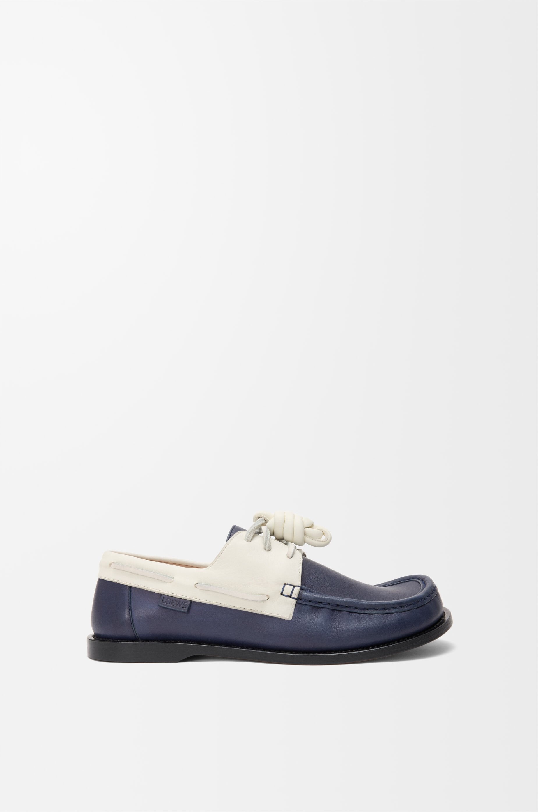 Boat shoe in two-tone soft calfskin featuring the LOEWE signature round toe shape and a hand-sewn construction with a supple leather lining and flexible sole. - 20mm heel - Squared leather lace closure - Padded leather insole - Rubber-injected leather outsole - Removable Flamenco knot - LOEWE embossed tag placed at the side Details - Colour : Navy/White - Main material : Soft Calfskin - Heel height : 1.5 - Weight : 0.75 kg - Model ID : LLSCS08X12 - Made in : Italy